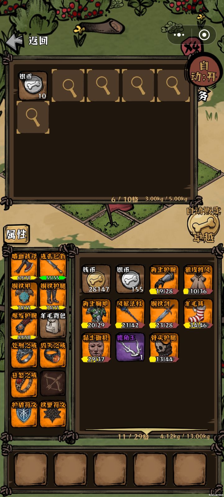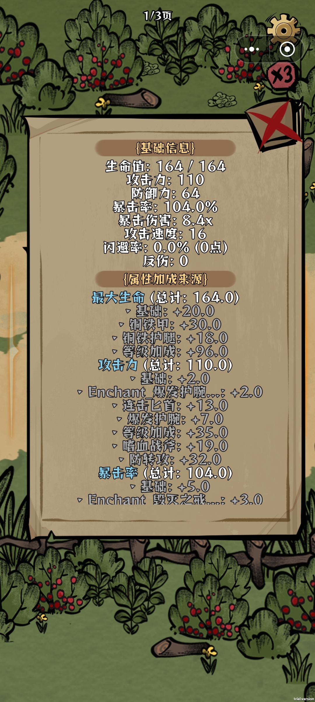 100级,不带药的情况下可以挂机到村长房间50层。试过回血流,暴击流,闪避流,连击流,最终还是暴击流感觉比较好。回血流的输出太拉了,推图困难。闪避流看脸,很难没一波都闪避成功,因为本身就是牺牲了输出堆的闪避,推图也推不太动。连击流更莫名其妙,首先是他的角色面板里就看不到连击的数据,其次是我都堆到70%多的连击了,也不会连击,不知道是不是bug。暴击流我把暴击率拉满到100可以刀刀暴击,基础攻击力主要靠装备和铁壁符文堆。哦我选的是三戒指天赋,舍弃了一个头盔。目前最高只能到100级,有几个踩过的坑分享给大家。