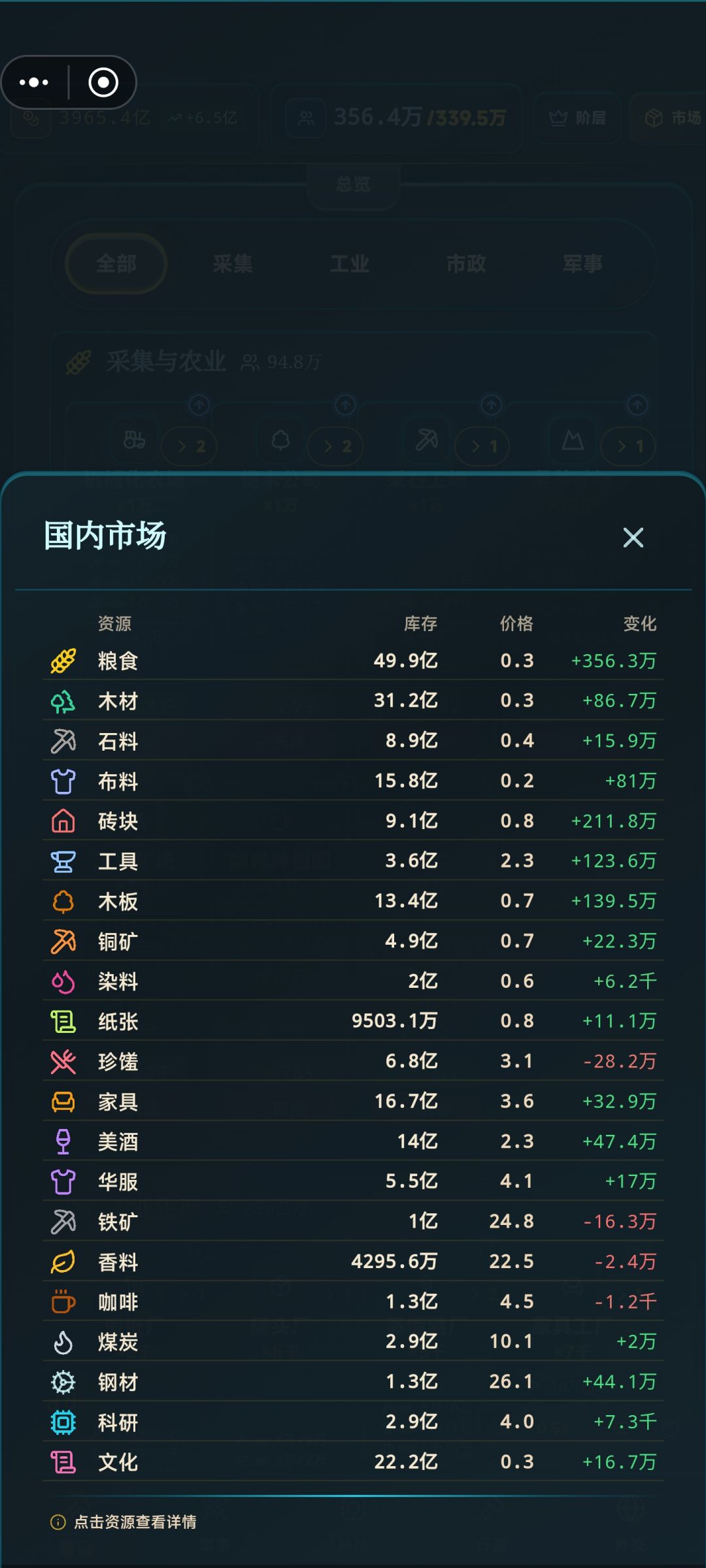 前期过度需要注意平衡各生产原材料的价格,哪个贵了就建设哪个原材料的工厂,各阶层看着收入适时调整人头税确保收入不为负数。适当把营业税调整为5%(五个点),出口进口税都调整为3%~5%。手上有钱才能对各阶层进行补贴,不然会暴动,同时注意对外派驻商人用来平衡国内物资价格。这个游戏最重要的就是“平衡”。还有官员会腐败,忠心度下降小于70就可以踢了,然后再招募就行,腐败的官员会贪掉你政府的税收,导致收不上来税。官员收入不足就会腐败,想要让官员不腐败就是让他们多建设各种产业。到后面有些工厂不生产是因为没有利润(原材料价格高于产出产品价格)就会停产,这些产业可以进行适当的补贴让他们生产起来。