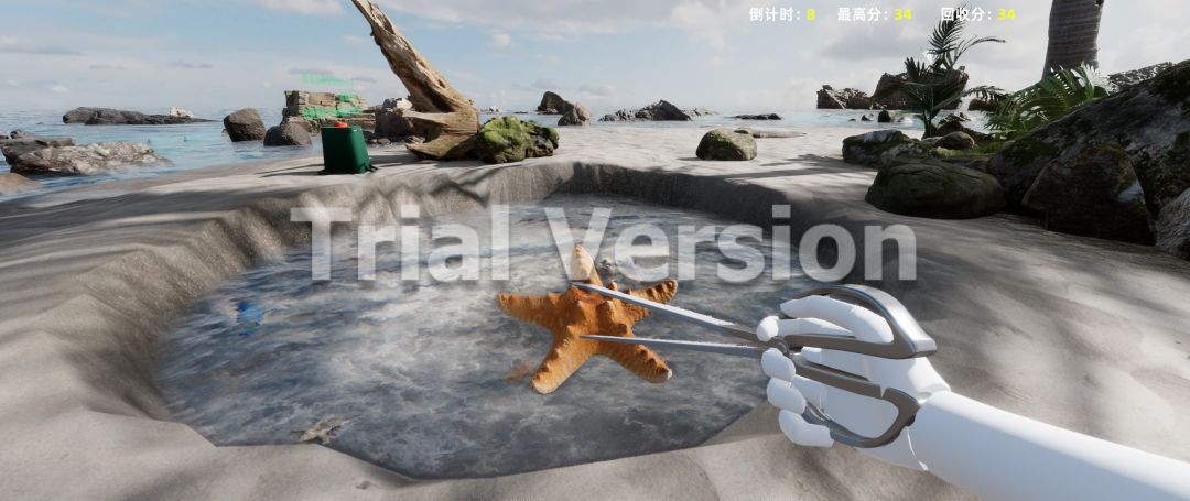 3D写实+卡通画风,写实的是场景,拟真度比较高,水天一色的效果看起来也比较好。角色、各种海产都是卡通造型,看起来很出戏,至少现实世界不会突然出现超大只海星,或者眼睛大大的海蚌、鱼类。夹子什么都能夹起来,也是挺神奇的。