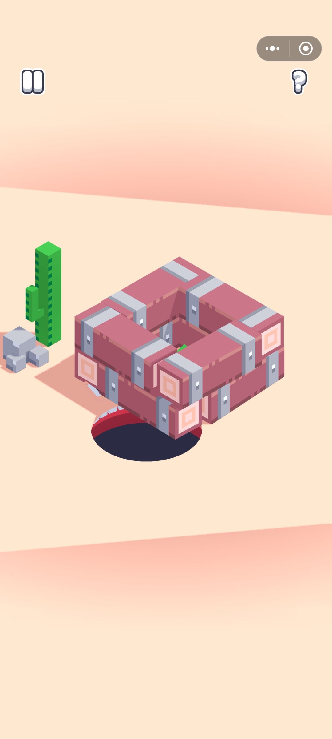 为了增加游戏的难度,游戏每隔几个关卡就有不同的主题,第一个主题非常简单,因为这些白色的小人看到我们会本能的避开,只要我们不在他们周围拉扯就可以顺利通关;但第二个主题就有些难度了,因为绿色的小人会本能地追逐我们洞口的脚步,主动跳下去,因此我们要学会放风筝,通过在周围吸引他们的视线,等到它们与物品有一定的距离后,我们再快速的挪动回去,打一个声东击西;第三个主题多了一个限制,除了不能吸人以外,还不能让物品掉出周围的边框外,不然也会结束游戏,这个主题的建筑都是高楼,所以很容易就会打破第二个限制,难度再次上升。