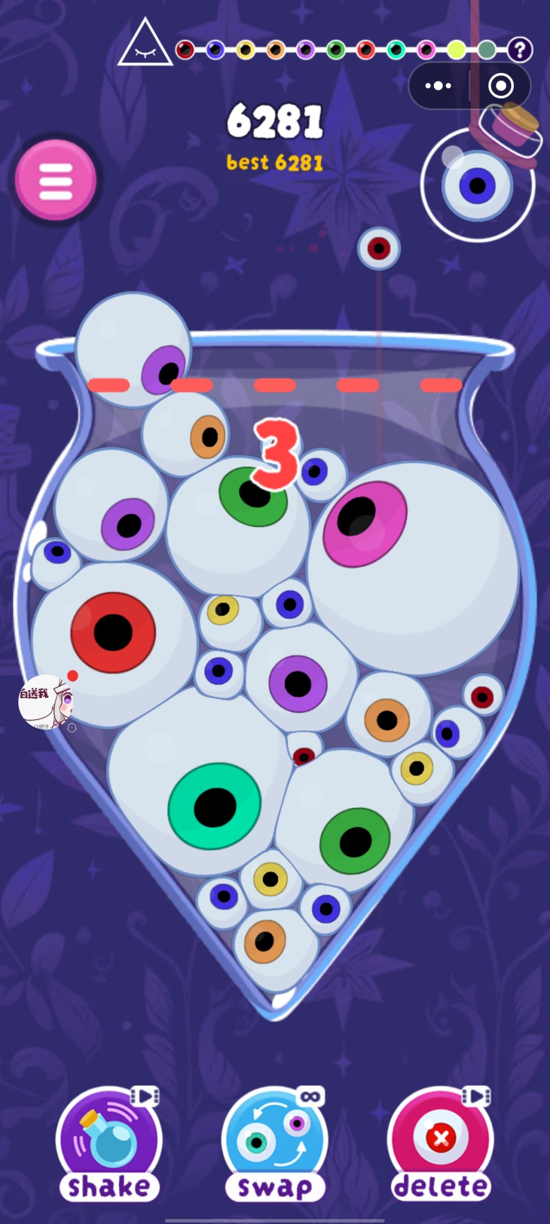 游戏玩法虽然是类似于合成大西瓜,但是也是做了一点创新的,游戏合成都在瓶子里面进行且每一关的瓶子都并不相同,瓶口以及瓶底都不是那种方方正正的,玩着还是挺有乐趣的。玩家在游戏里面需要合成关卡所需的眼睛,才能够进入到下一关,且瓶子里面剩下的眼睛也会倒入下一关的瓶子里面,不过比较有趣的是在倒入的过程中,眼睛们也会进行合成。游戏失败的判定规则也比较的简单,即当有眼睛过线且时长超5s即为失败。