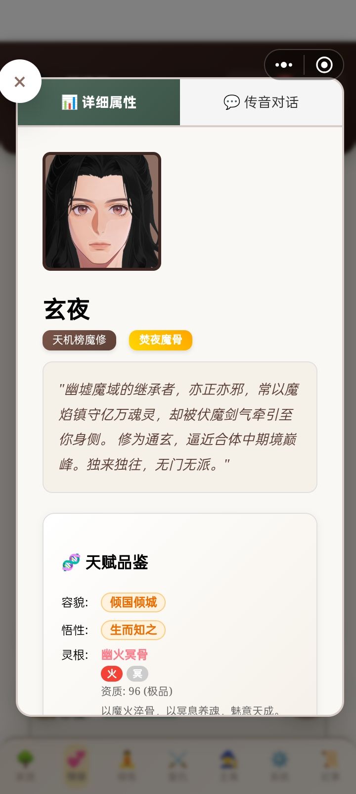 挺好玩的,内容挺新奇的,第一天熬夜玩到凌晨两点,结果再玩的时候发现读不了档了,眼前一黑😂再开新档,发现第一代固定只能生十个孩子,然后每个孩子固定只能生三个孩子,再往下就生不出来了,不明白是我自己的关系,还是游戏的问题有两个情缘的好感值是固定的,偏他俩灵根还特殊让我眼馋啊建议增加正邪之间的冲突,增驾一下孩子加入门派之后因为正邪冲突而经历的事情,也可以战死啊陨落什么的另外,孩子的情缘应该和孩子自身的资质相匹配嘛,都金丹了,再找个练气的也不合适嘛