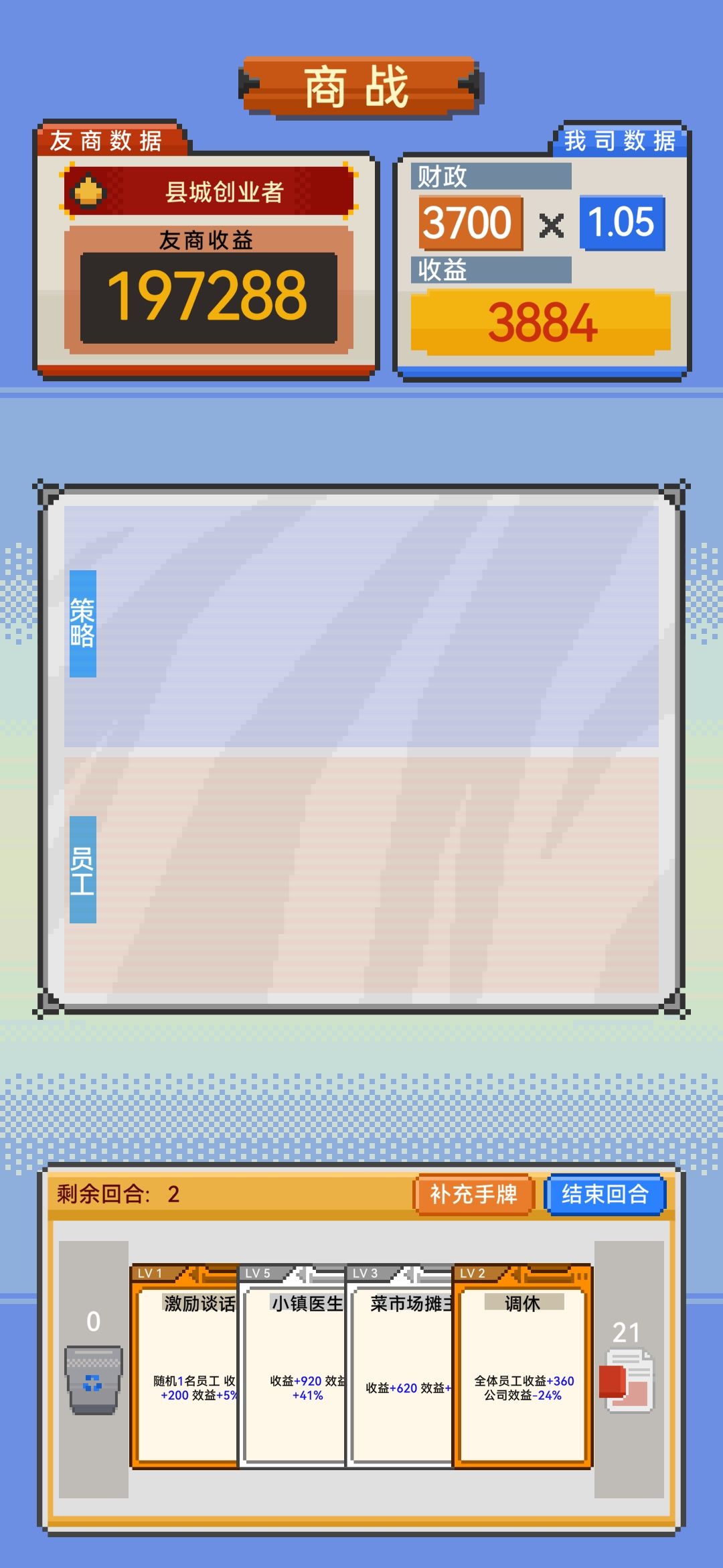 🎲随机性设计:卡牌池深度适中,10分钟左右就能大概了解大部分卡牌效果。😵游戏难度:适中。对新手友好,肝度较高。✍🏻PS:提升难度后(普通,困难),分数要求需要降低点难度,跟新手期对比出现断崖式提升,玩家需要在十里坡当十年剑神才能出门(也有可能是作者的小巧思,机制没研究明白)✍🏻PS:新手期:计算公式:总收益=公司收益*公司效益公司收益=所有员工(员工收益+公司前置收益公司效益=所有员工效益+测略效益前期提升测略效益为主,员工效益高倍数优先前期天使,中期商战,后期调整。