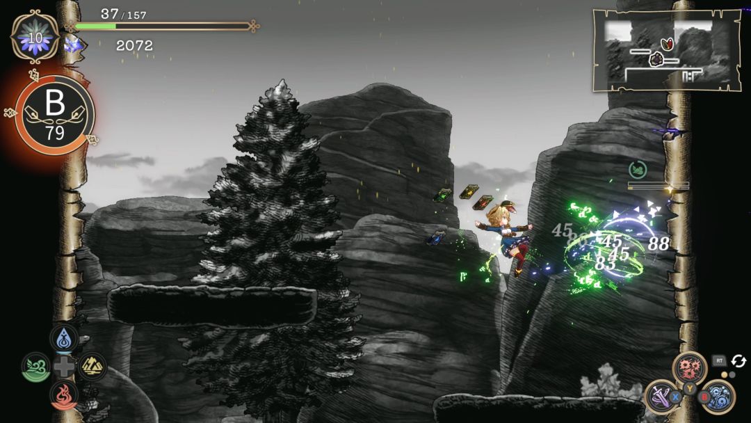 本作的战斗主要是以快节奏,再辅以各种华丽的魔法的战斗,当然最具特色的就是女主的各类魔法。除此之外,女主还有各种魔法增益的装备,可以用来提升魔法的能力或者是减少冷却的时间。在本作中,如果单一使用某一个攻击方式会很坐牢,因为小怪很多,还是混合出现的配置,硬着头皮上还真有打不过的情况,所以最常用的方式就先开个风刃,把近战武器改成中远程,还能跳起来浮空的打。