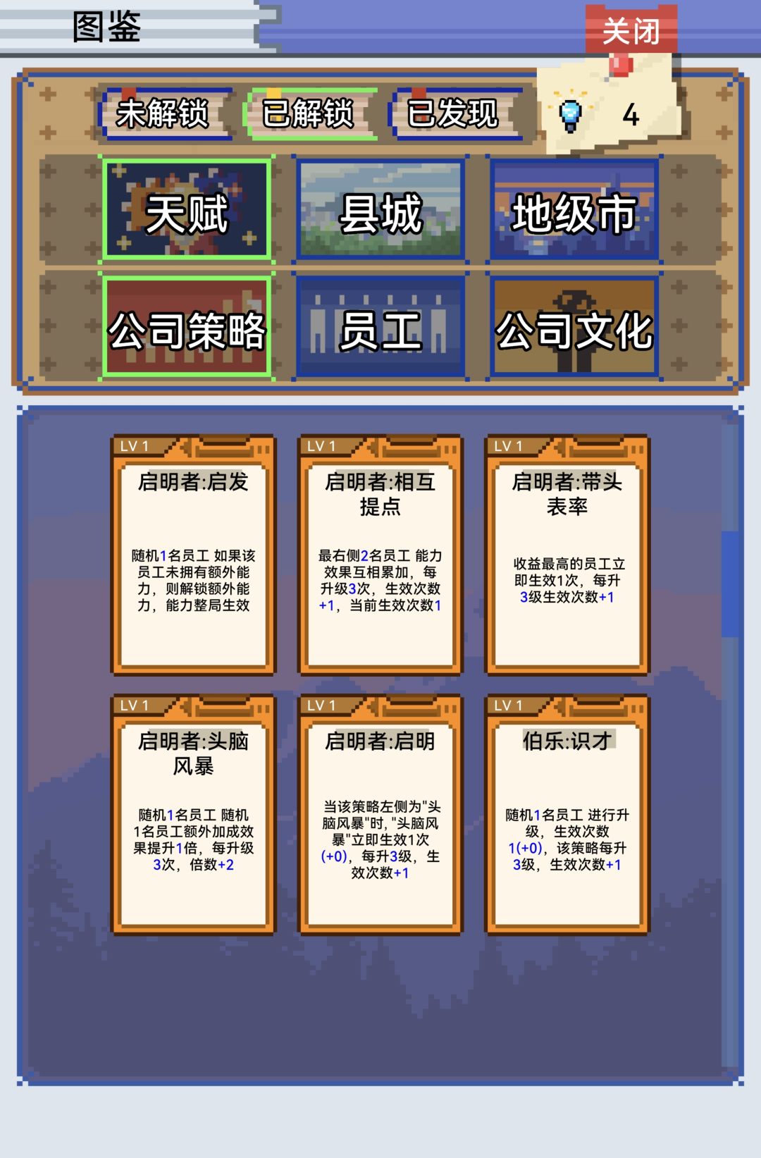 图鉴解锁的东西没出现过,建议将卡牌组成卡组,玩家可以自选一定数量卡牌而不是纯抽盲盒,玩普通模式只能抽到9张员工牌,卡了四次最后一个月过不了