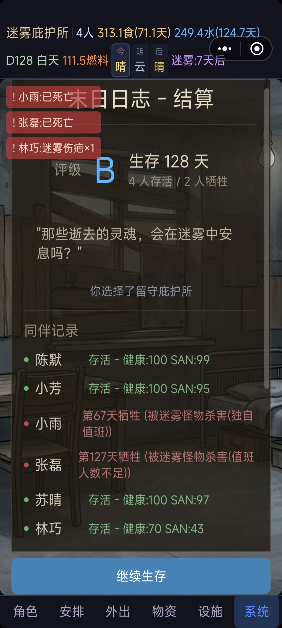 1.电瓶车和小电驴是要分两次解锁?搜索到一次车辆只解锁了一个,且只能在加油站才能探索到么?玩到后面所有设施都升完了,还是被卡住只能探索近和中距离地区2.前期没升防御的时候会被偷东西,后面防御起来根本碰不到战斗场景,仓库一堆子弹和武器好像也没用,我还特意在迷雾中开两次门 都是直接剧情杀,是没有战斗系统吗?3.感觉作者大大可以加一些适配环境天气变化的背景音乐(比如遭遇特殊事件或者极端天气配乐)个人感觉会更有沉浸感一点,目前游玩全程无声 有声音个人感觉游玩体验会更好