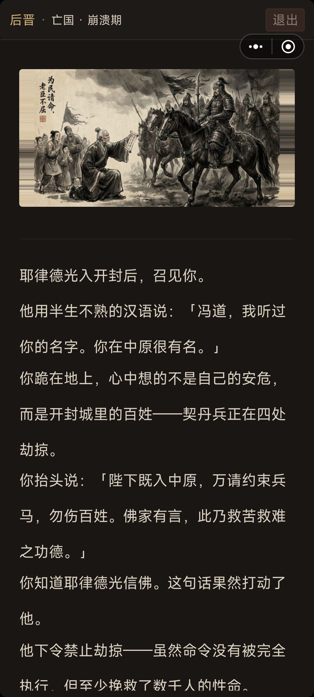 完了几次,总的来说很不错,看得到无奈的一些选择,很无奈的一些历史讲游戏,玩了3次,暂时两个问题1是我手机问题吗?类似第一张图这字幕出现半截很难受2部分剧情感觉有点错位,我之前选择出使,过程中得到契丹赏识,但是后来出帝时期兵败,契丹攻破开封,这耶律德光又从赏识挽留变成了听说过?