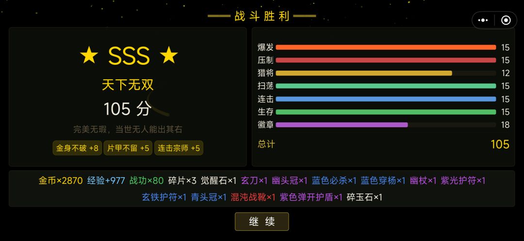 掉落系统也比较良心,精英怪和小Boss都有不错的掉率,而且评分越高掉落品质越好。SSS评价能额外加3级品质,所以每一局都有动力去追求更高评分,不是打赢就算了。就算打输了也有击杀奖励,不会空手而归。
