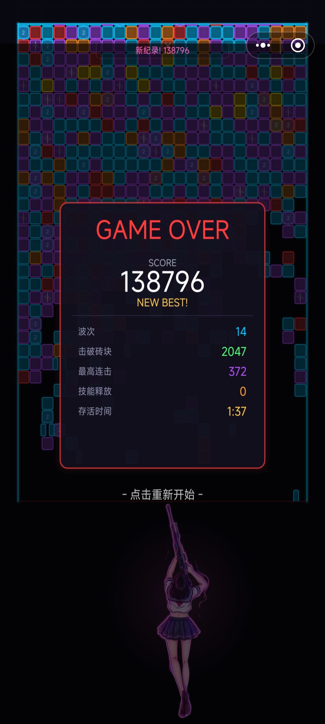 纯2D效果,界面结构简单,UI品质一般。女主只能看到背影,无攻击动作,只是静态图而已。战斗的子弹特效单一,可以通过三选一改变大小。上方方块样式很多,不同外观和形状差异化明显很好辨别,可以优先打击目标。砖块被打爆的碎裂感很好,表现效果很解压。