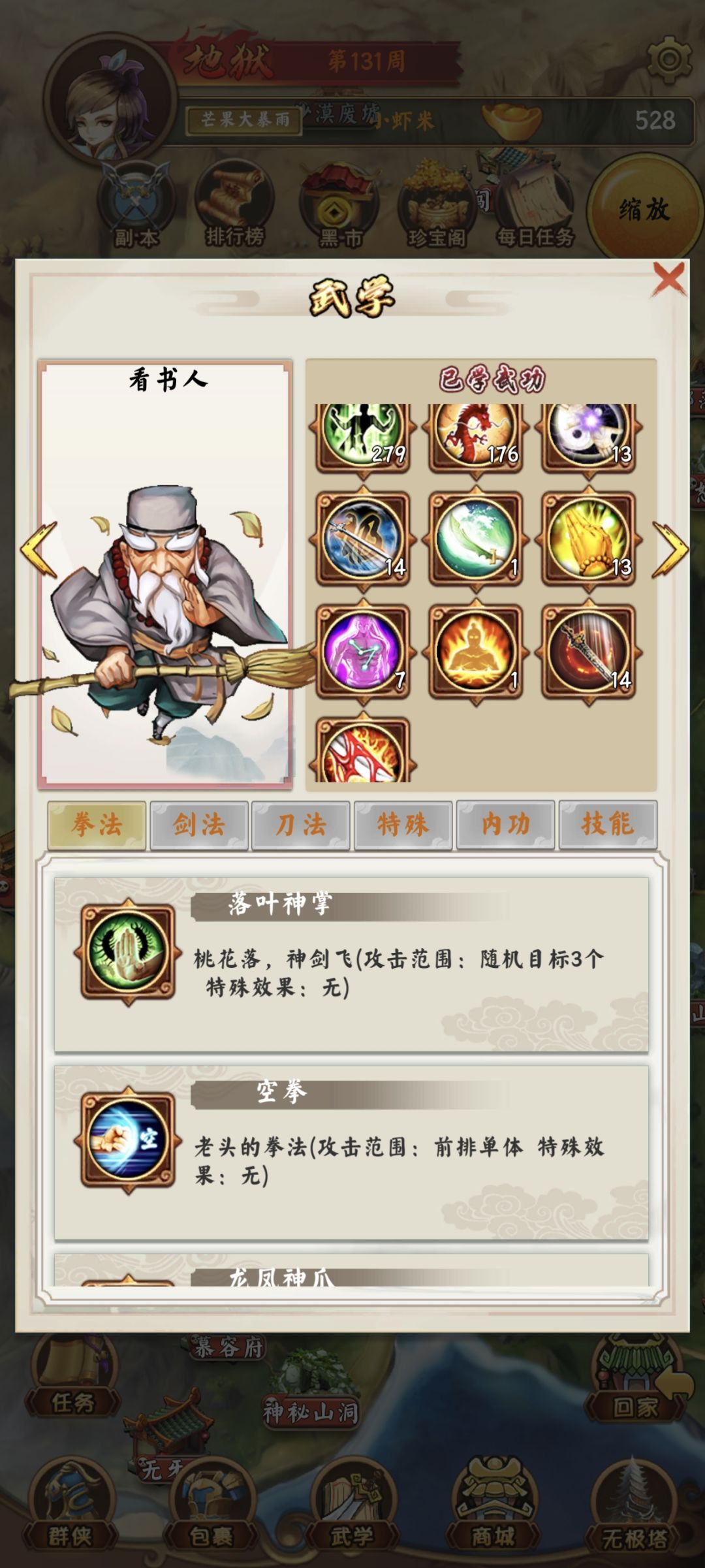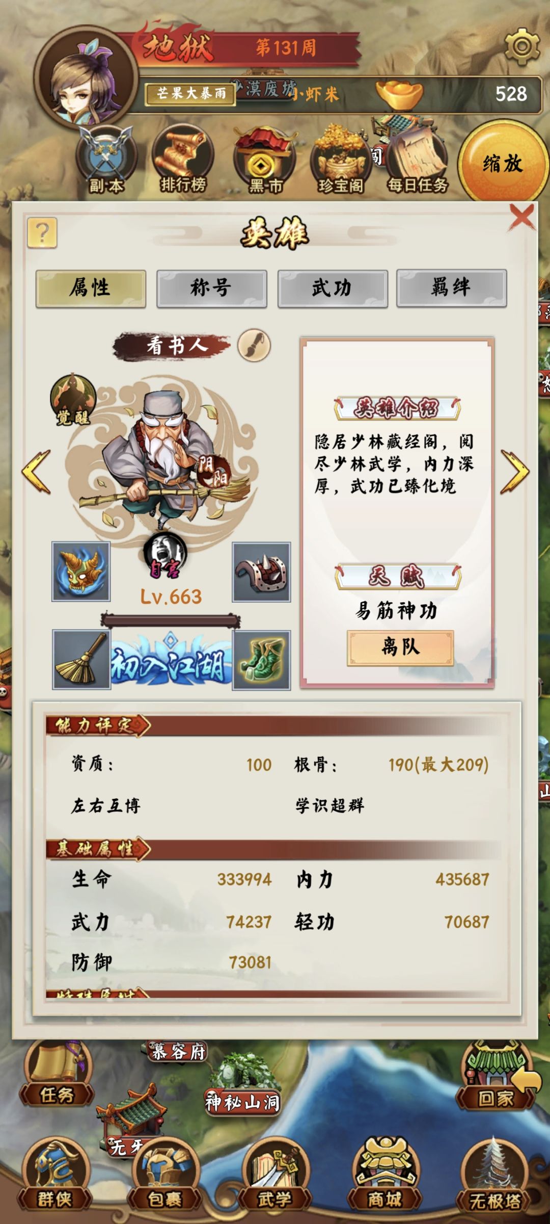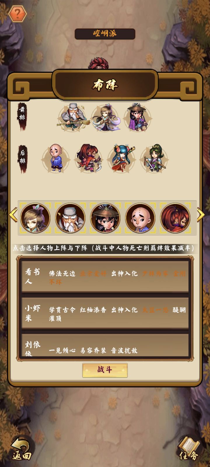 贫民玩家前期最强阵容。扫地僧+四个锤子+扫把+鬼神面具,刘依依+鬼神面具,萧灵颖,苏雨柔,李云芷,小和尚 在加上血瓶,共3400元宝有条件就买鞋子,和加强护腕,玉佩,前期直接招郭静,去高升客栈找黄蓉,选择否,然后洪七公直接逃跑,桃花岛直接逃跑,打蜘蛛救老顽童,学会左右互搏,就可以直接用智力单了,全力培养扫地僧就可以,有肉有伤害,前期炼狱模式刷完后,第一个奖励一定要刷,首选洗髓丹,天书,智慧果, 2000周以后在考虑换独孤求败,后面才需要闪避,