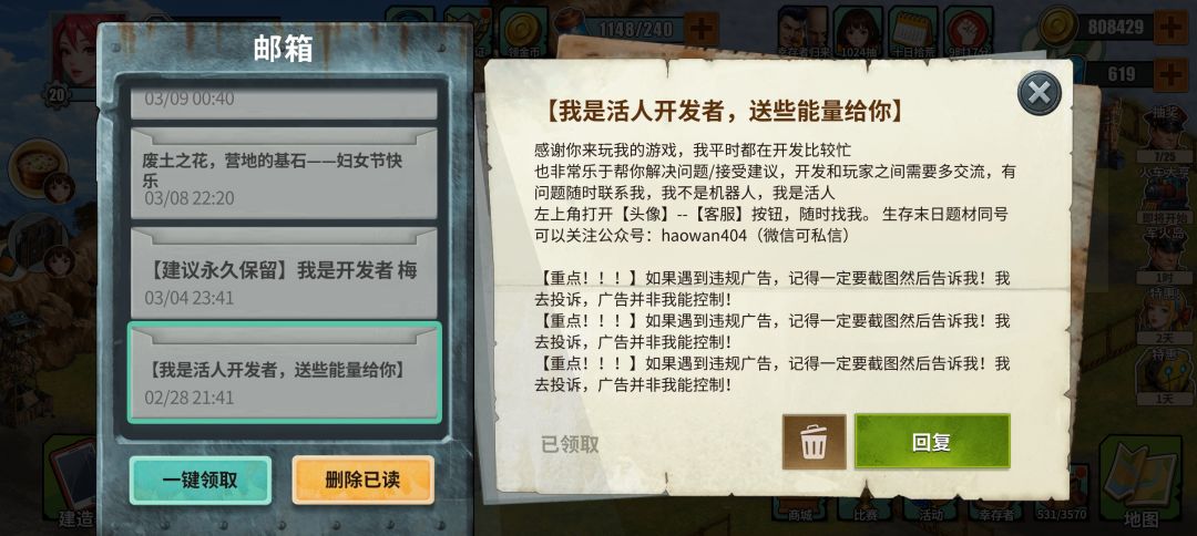 3️⃣美工部分是ai的但画风也很有特色,游戏里面反馈也很好,收菜领奖励都挺爽的,ui界面也简洁明了,末世经营的核心玩法贯穿始终