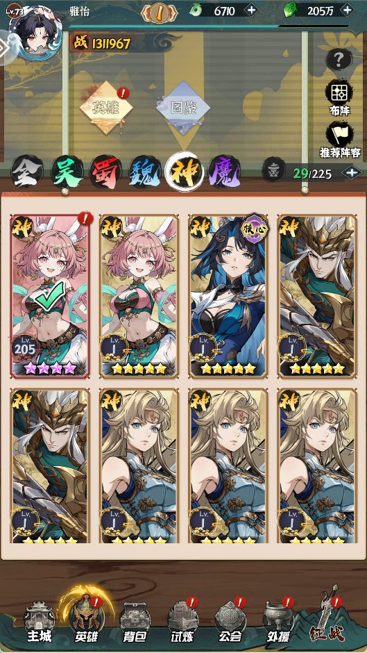 玩了一个月,谈谈感受。魏蜀吴很容易出,狗粮也多,白嫖能玩,特别吴国的灼烧前期还是很舒服的,黄盖爬塔也猛。至于神魔,吃相太难看,占星商店也买不到核心本体,只能靠充,而且充的额度太可怕,低V望而却步,反倒让这游戏返璞归真,大家都玩三国不碰神魔,也是有意思。神的辅助很强,兔嘻嘻容易出,我6元党也快10星了。其他可以不搞,就把魏蜀吴里面的核心武将技能研究透,组合搭配阵容即可,也算比较轻松。