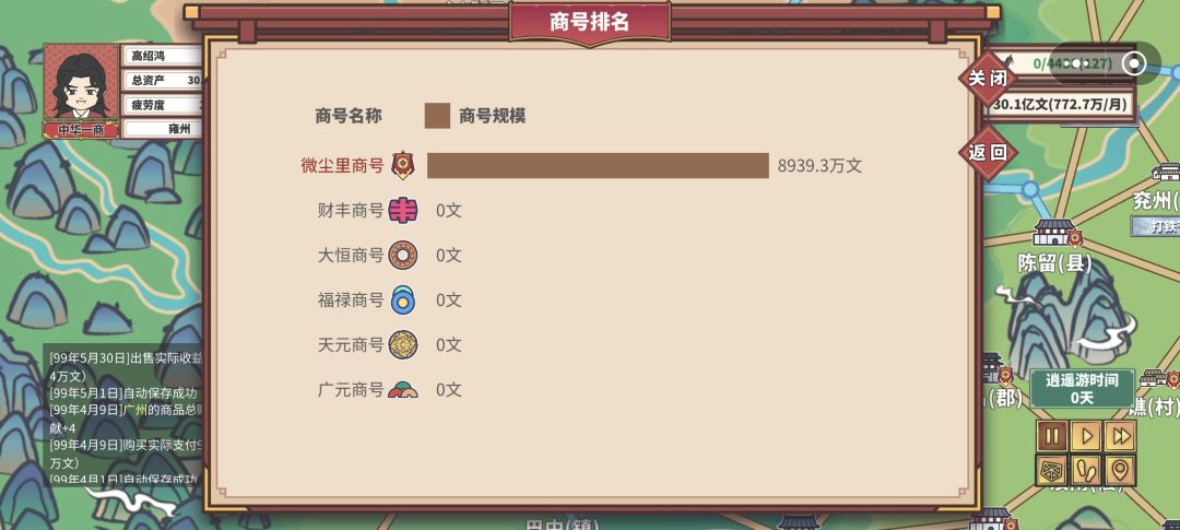 1.是商行的机制问题严重,玩家的视角要对抗所有商行,等于在前期同样行动力的情况下,有 5 个行动力在和你抢市场。而后期他们因为不会使用商战就一方面倒。如果换成每个城市可以驻扎多个商行而不是两个。而且每个商行互相都会商战。而且每个商行都会有仇恨值,谁欺负了他,他就更倾向于报复谁。这样会有意思一些。(不知道是设计漏洞还是什么原因,开场的时候 我去不了海岛 去不了西域,NPC 全都能去,先去抢占市场。)