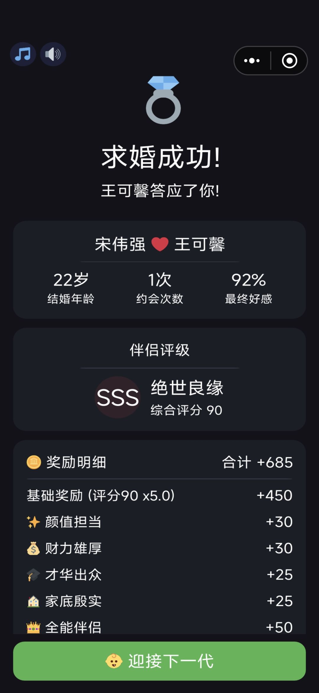 15分钟不到直接就点到头了,不太建议玩,无脑选高分就行。后期另一半评分太低了完全跟不上主控