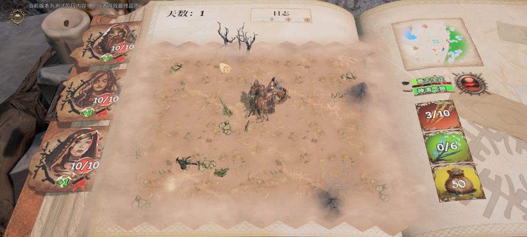 战斗正式开始前可选择英雄,携带初始资源等,操作不复杂。进入游戏后可探索地图,没有用常规的肉鸽线路分支,而是整张地图自由行动,探索战争迷雾。在小地图上标注了事件位置,行动目标也有指示游标,方向很好辨别。有食物和英雄疲劳度等设定,疲劳后需要扎营休息,根据地块环境扎营效果有差别。扎营休息会消耗食物,同时可以升级装备、冥想、治疗疾病等操作,后二者需要消耗更多物资。