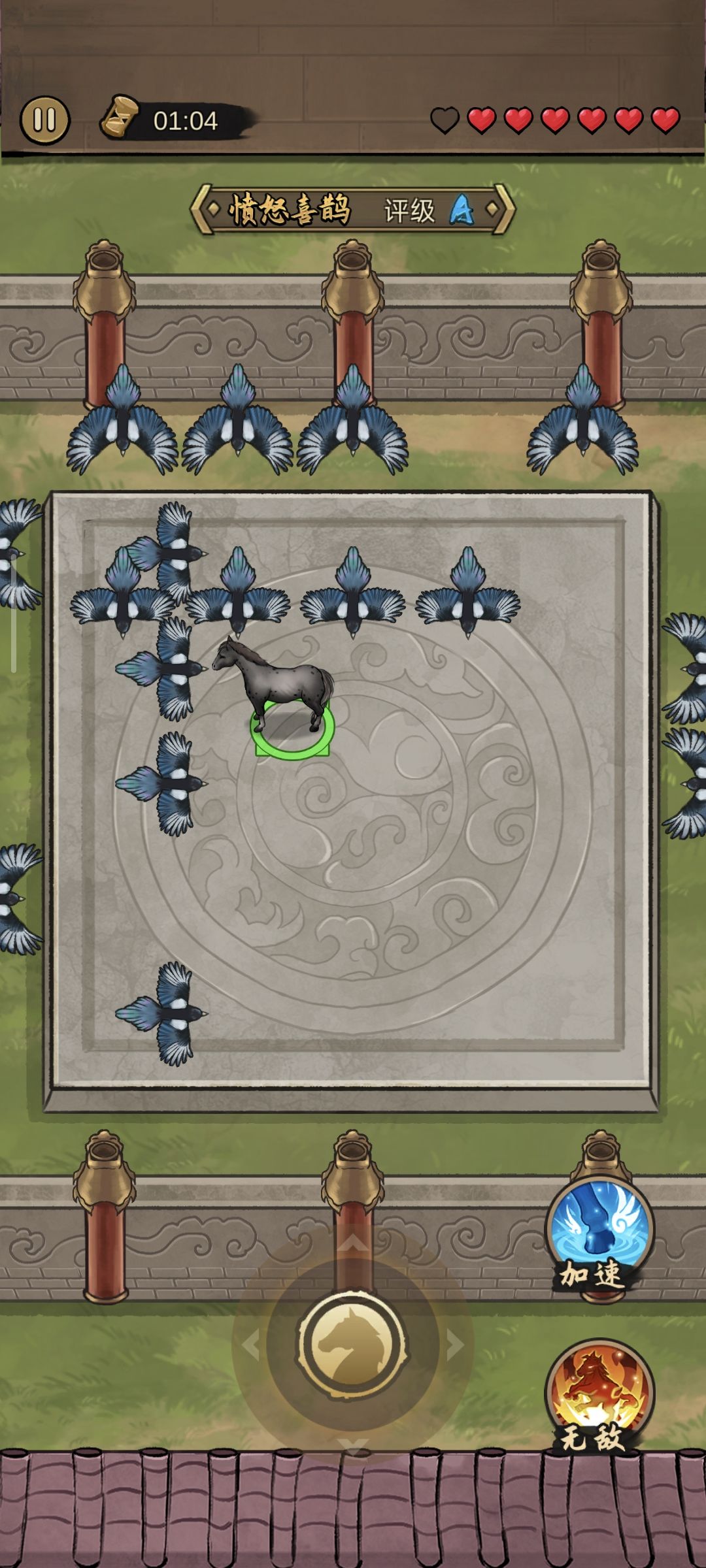 游戏还可以就是不能看广告很肝,还有这里给各位玩里面小游戏喜鹊过不去的小伙伴分享一些无敌点位思路,像这种两只喜鹊中间是有一个刚好可以站住的地方,找好就不用动直接站到结束游戏,实在不会找的可以参考我的站位,这个位置不会被上下左右的喜鹊攻击到,另外一个模式也是这个原理,很容易就过关。