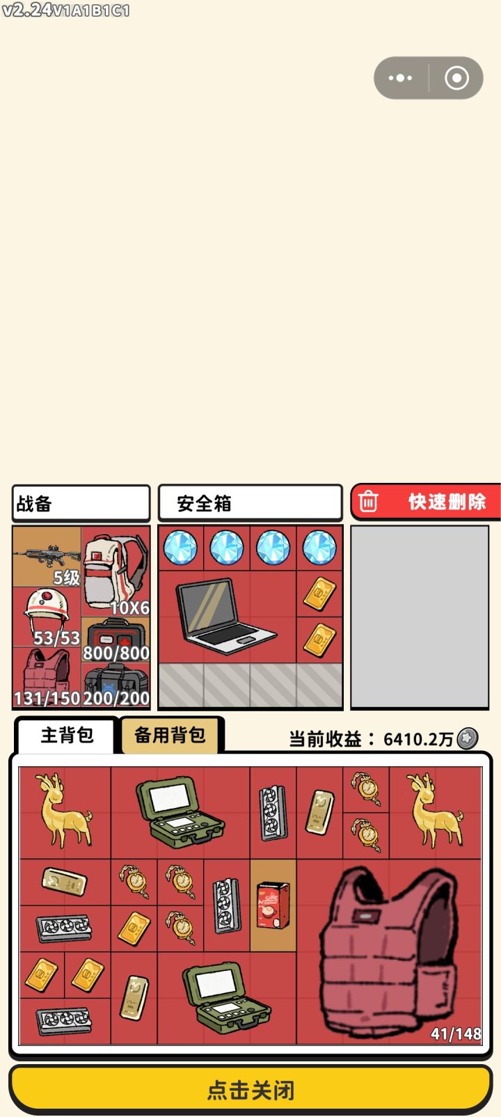 新增红色物品的话,那么属性这一块就也得唠了。拉满的16格保险是完全够用的,所以不如钥匙卡分地图使用。保险拉满之后,藏品的红色词条就给那个副背包吧,区别于保险就是死了里面的物品会掉。(爆率高,大红包也容易燃尽。)