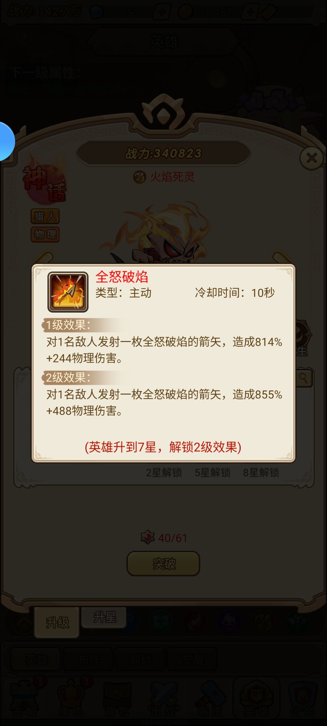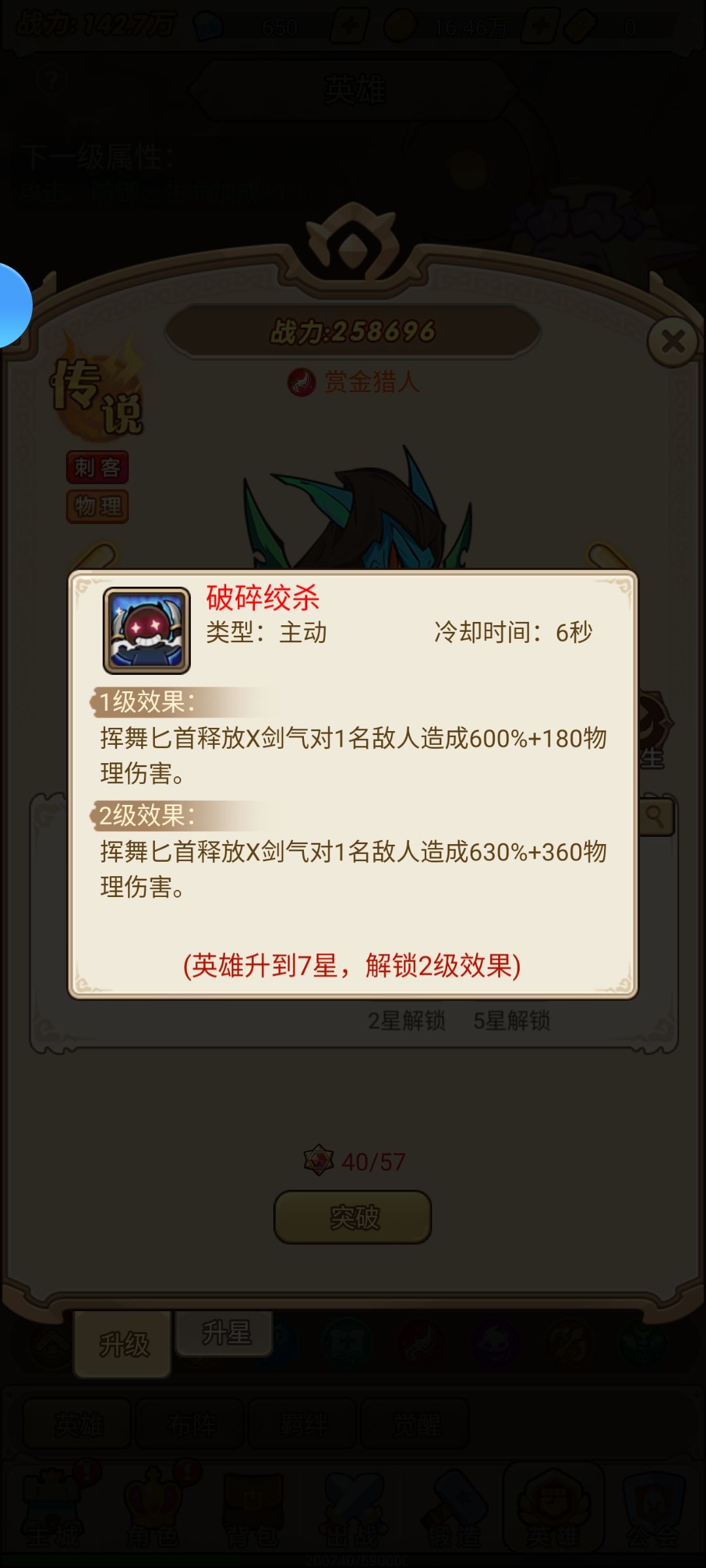 这是一个并没有深度的半挂机游戏,就是简单的增加基础属性堆战力,而英雄也如图技能都大差不差,猎人和刺客单攻,战士和法师群攻!