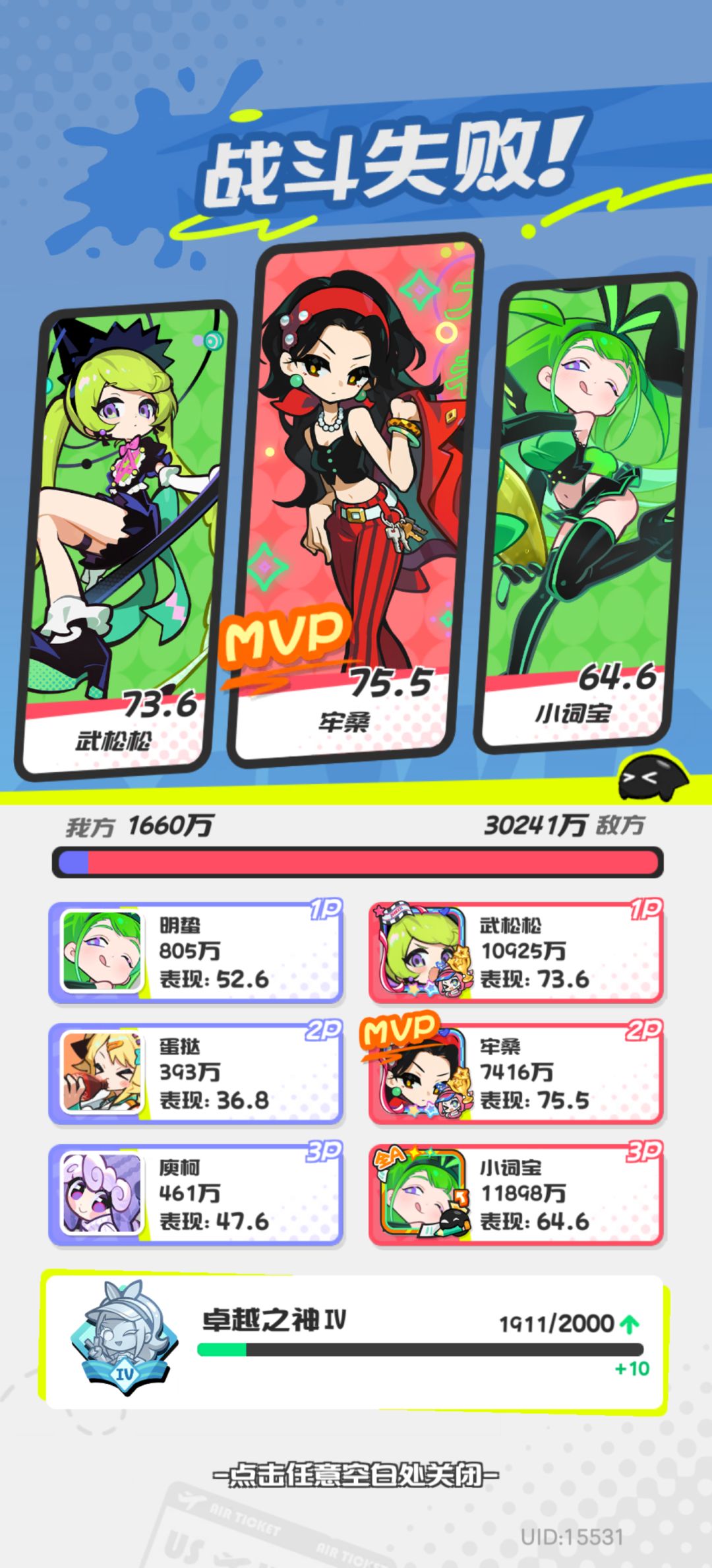 对面两个3V3榜前20的头像框和一个统考活动榜前5的框,我方只有二楼有一个满阶角色的还打不出该有的伤害(有动态头像),这还玩个毛。
