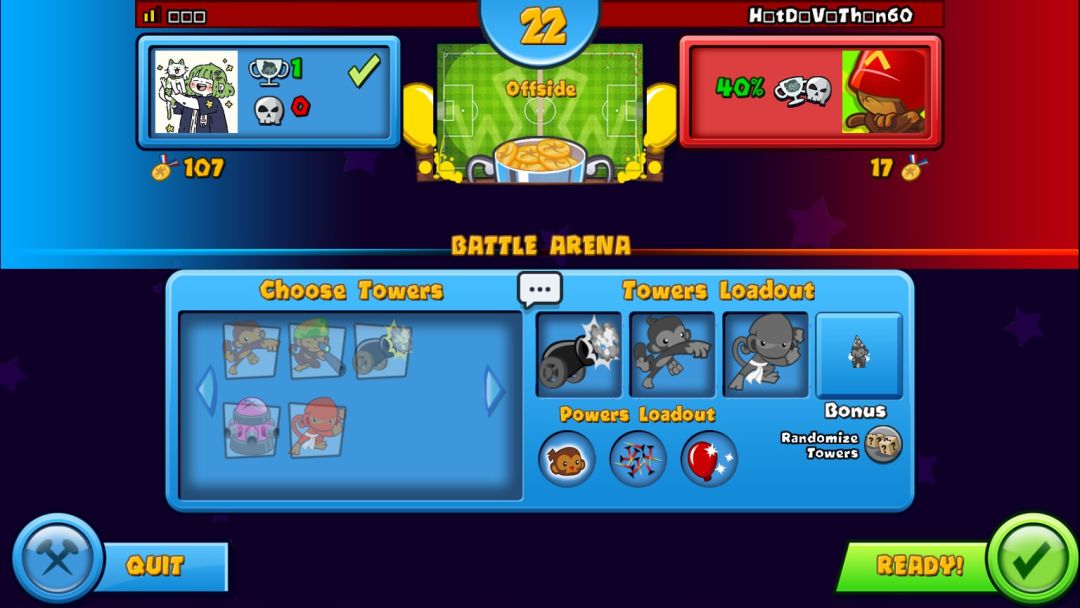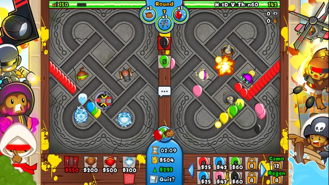 →核心是比较经典的塔防游戏,类似于保卫萝卜,但是其它设定比较特殊:塔防不是关卡制,玩家需要与其他人或者人机展开对战,在放置防御塔应对系统性的气球大军的同时,还得花额外的钱点击购买气球去攻击敌人的防御塔,不同颜色的气球效果也不一样,双方谁的血量先见底谁就输,其他就是比较正常的玩法,防御塔可以升级、游戏外商店可以替换其他种类的防御塔,累积经验值之后还可以给相应的防御塔进行升级,除了核心玩法之外,游戏还有其他的模式,卡牌对战,突击模式以及防御模式,这些内容的增加也让游戏的玩法变得丰富。