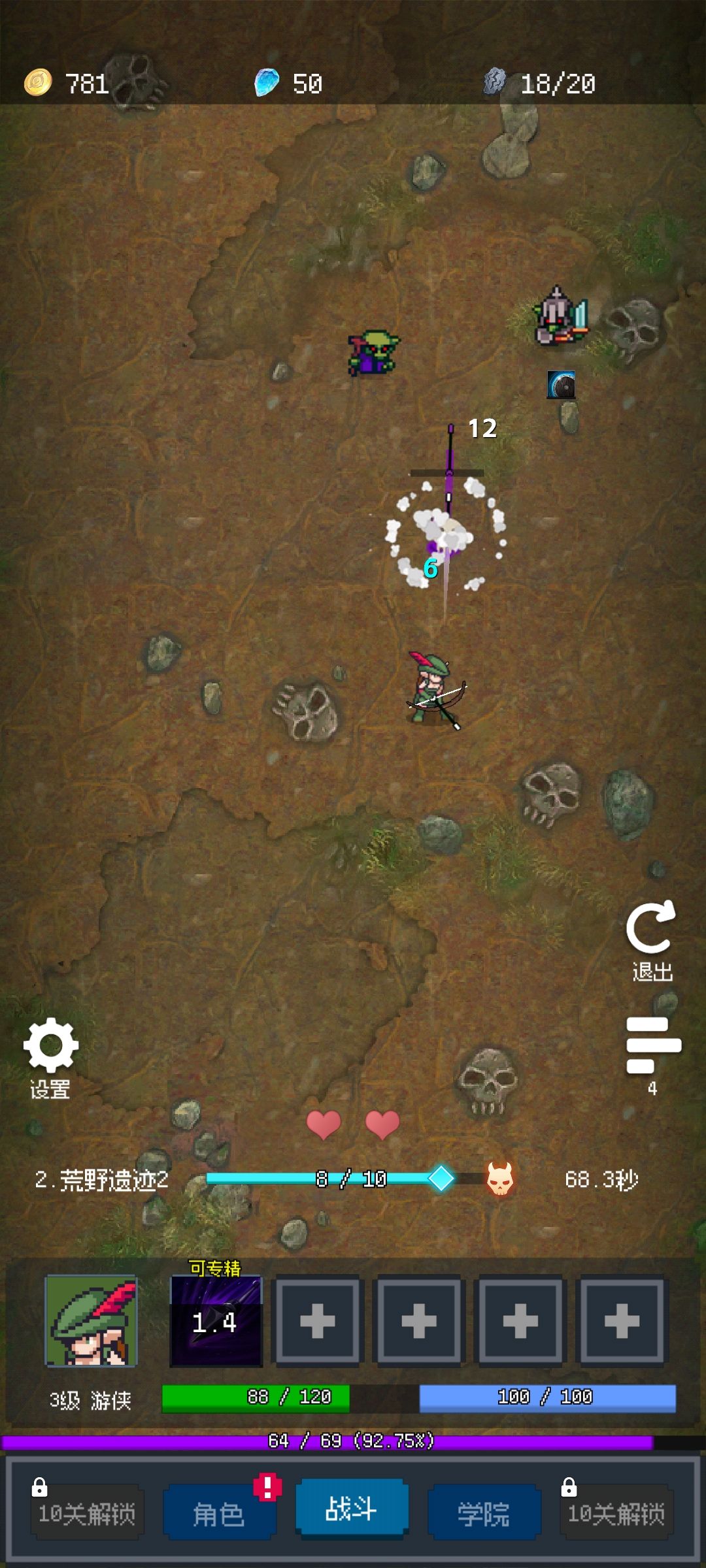 2D像素画风,界面结构常规,UI品质一般。角色目前两名,弓箭手和法师,带有魔幻题材的经典职业设定,从外观上可轻易分辨出来。战斗有简单骨骼动作,突出技能攻击效果,清理小兵有类似割草游戏的战斗爽感,BOSS战斗对数值压力较大。基本意思表达清晰,很好理解。