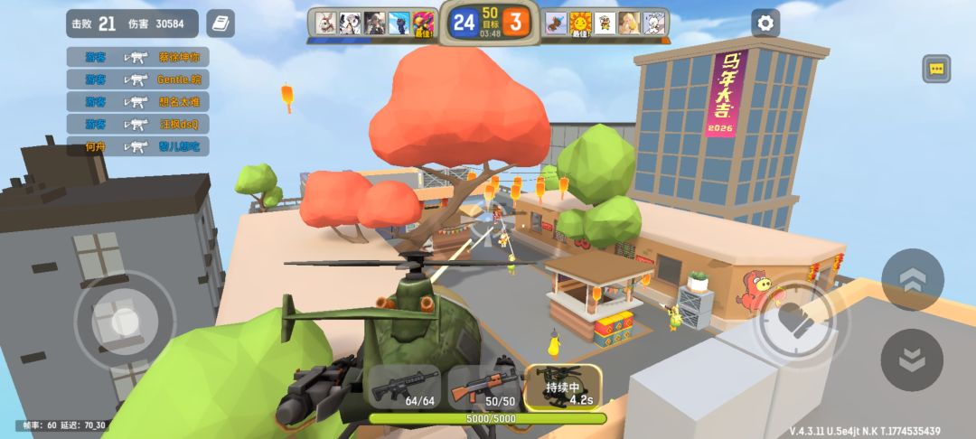 3D射击类游戏,操作设定比较常规,没做介绍的情况下,摸索下也能玩。采用匹配机制进行游戏,初期有机器人填充四名队友,对面五个全是机器人,战斗难度不高,一局50人头轻轻松松可以拿到40+个。瞄准有准星吸附功能,将准星放到敌人身上即可实现自动锁定并射击,武器射速也足够快,拿人头很轻松。