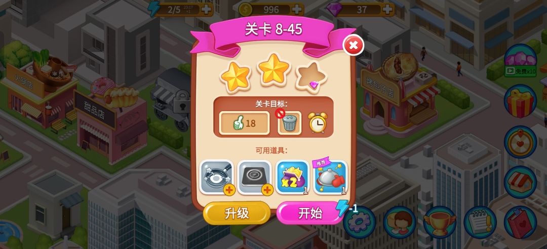 嗯……玩到后面玩不下去了,从甜品店就初见端倪。步骤变多了,被拆分了;时间变少了,要求变高了。之前过关凹一凹就能过,从炒菜店开始就恶心了,如图所示,我用了各种道具都不能满星45关。好样的好样的,搞个最垃圾的自动上菜也不搞一个能加时的(目前能加时的只有游戏时间到,还没满一颗星的,判断游戏失败才会弹出加时; 满了一颗星或者两颗星的加不了时,直接判定游戏成功)。自动上菜为什么是最垃圾的呢?自动上菜是需要你把菜品按它的要求摆好之后才给你上(如蛋糕要加奶油),甚至可以说基本上还是靠自己摆,最后一个点给顾客的步骤才到他。平时根本就不会用到自动上菜,只有卡关了才会想起来用,但是这玩意就是来扰乱节奏的,用了等于没用还得重新习惯。