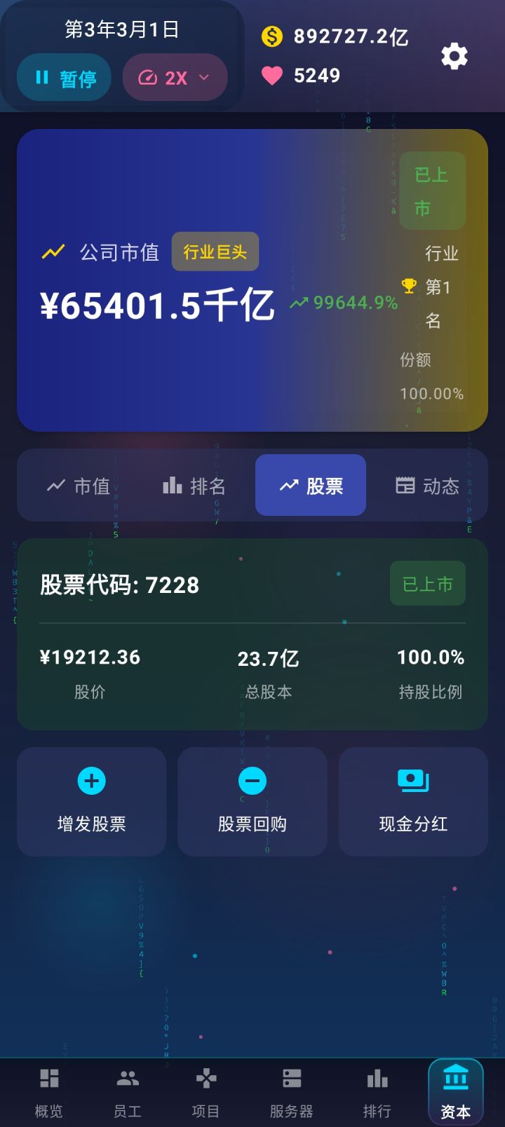 3分给创意吧,经营和股票结合了,好的大家都看得见,就不说了,直接说说我自认为不够的地方,单机游戏,就玩家一家公司,上市也就一只股票,也没有模拟交易,股票就是个皮,没有任何实际内容。游戏开局,招募员工 就可以了,慢慢攒资金,员工工资有点扯淡 白板工资一千多到四千多都有,升级到蓝色变三千,橙色变五千,直接招募的橙色工资十万左右,升级还能降工资的,做网游充值选项,一个6元和5个628,在线人数居然没啥差别,排行榜也不合理,等到公司上市,游戏就到头了,公司数据完全崩了,各种不符合逻辑,分红就是把钱变没了,回购和增发也是瞎搞,上市后就是来回增发回购,钱就爆了。不过做游戏真心累,我之前因为玩了一款不尽人意的股票游戏,自己开发一款沙盒模拟游戏,有两百多家公司,经营十多个行业,差不多一百家上市公司,五十多个投资机构,搞了一年多了,还是粗略版,手机运行太费劲了,感觉有生之年都干不完了,再次感谢作者,期待你的后续完善版本。