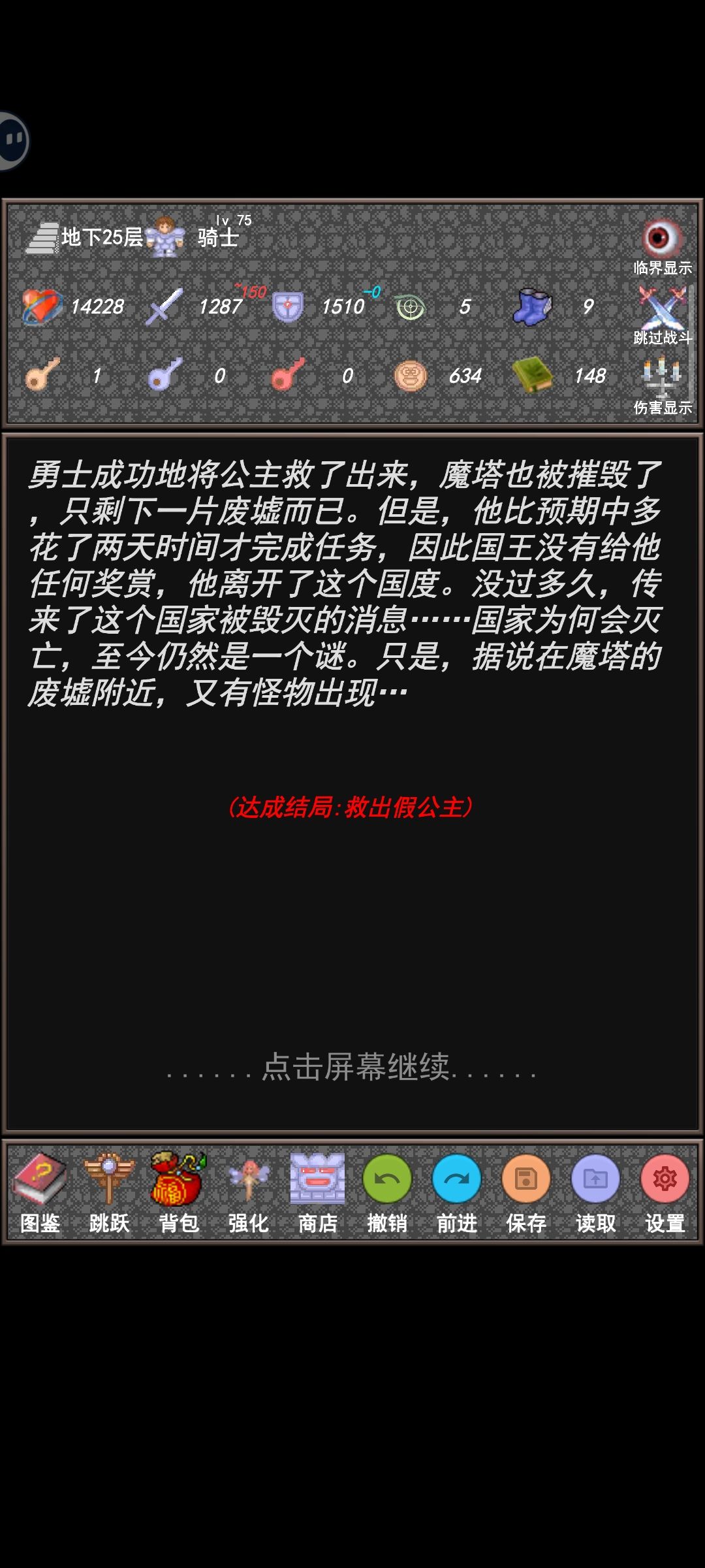 中间飘了多用掉了三个黄钥匙,换不出镐子,差点以为只能带假公主出去了,打出假公主结局后猛想起能买多把黄钥匙,立刻回档,操起镐子,劈山救主。