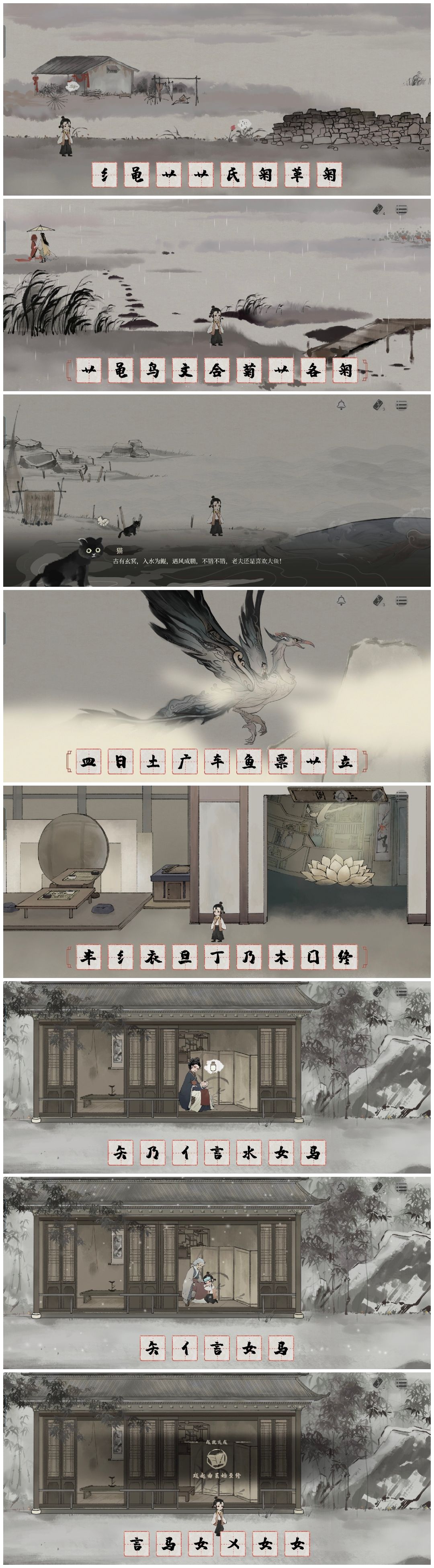 整体来说很不错的一款!也是前传,通过拆字拼字推进,很新颖的方式,也让我认识了很多平时接触不到的生字呐~水墨画画风爱了,搭配上音乐很有感觉!个别关的部分有一定难度,整体尚且,最后也解释了母亲为什么会离开辽沐了😔但也有点bug哈,多次出现“僵死”,除了人物能左右移动,其他什么都不能做,不能点物品不能拆字拼字,简单的来说就是死了,只能后台强行关掉重开,,,而且出现次数不是仅仅4、5次啊,希望能优化解决一下总体来说还是很推荐大家来游玩一下的!😋
