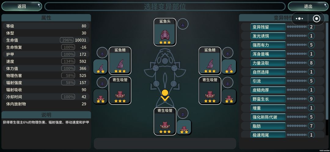 建议先玩几关 ,解锁鲨鱼头,鲨鱼翅膀 ,碎片拿来点复制关节,鲨鱼头有高伤害 ,鲨鱼翅膀移动快 ,复制关节能让你前期到后期都能增伤约66% ,升级后无脑点攻击 ,有野蛮加野蛮 ,没野蛮加体积加血量,如果觉得速度慢就加速度 ,前期用寄生暗杀精英怪,后期寄生真的就是定位器,可以增加伤害 ,只要不被秒六根寄生秒给你吸回满血