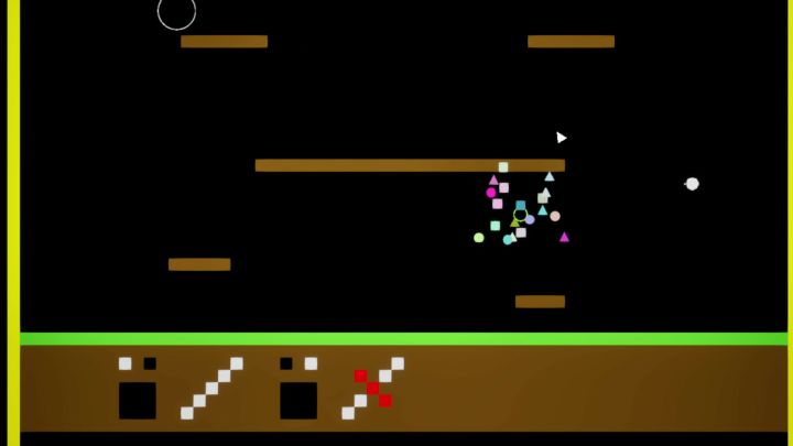 游戏的美术风格堪称“低成本高趣味”:纯黑背景上,彩色三角形、棕色平台、黄色边框形成强烈对比,像素化的角色和道具带着复古游戏的粗粝感。这种“粗糙”反而成了优势——没有精致画面的束缚,玩家更专注于物理互动本身。每一次钻圈后的三角形生成,像一场“像素烟花秀”,简单却充满仪式感。