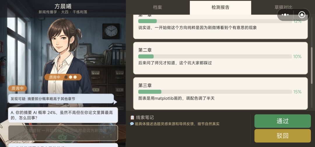 和新玩法和邻居伪人游戏是一样的,但是换了一个主题有新颖有想法。十几分钟,一口气通关,感觉偏故事文本,没有难度和过多玩法,表达的主题很明确。主要就三类:烂的,努力但是实力有限,有实力的。后面熟悉玩法了,都不需要问完出一个就知道能不能过了。ai不是错误只是工具,怎么利用还是看人横屏状态下能看到问答有ABC三个,但是最下面的c看不见,但是能勉强点到。