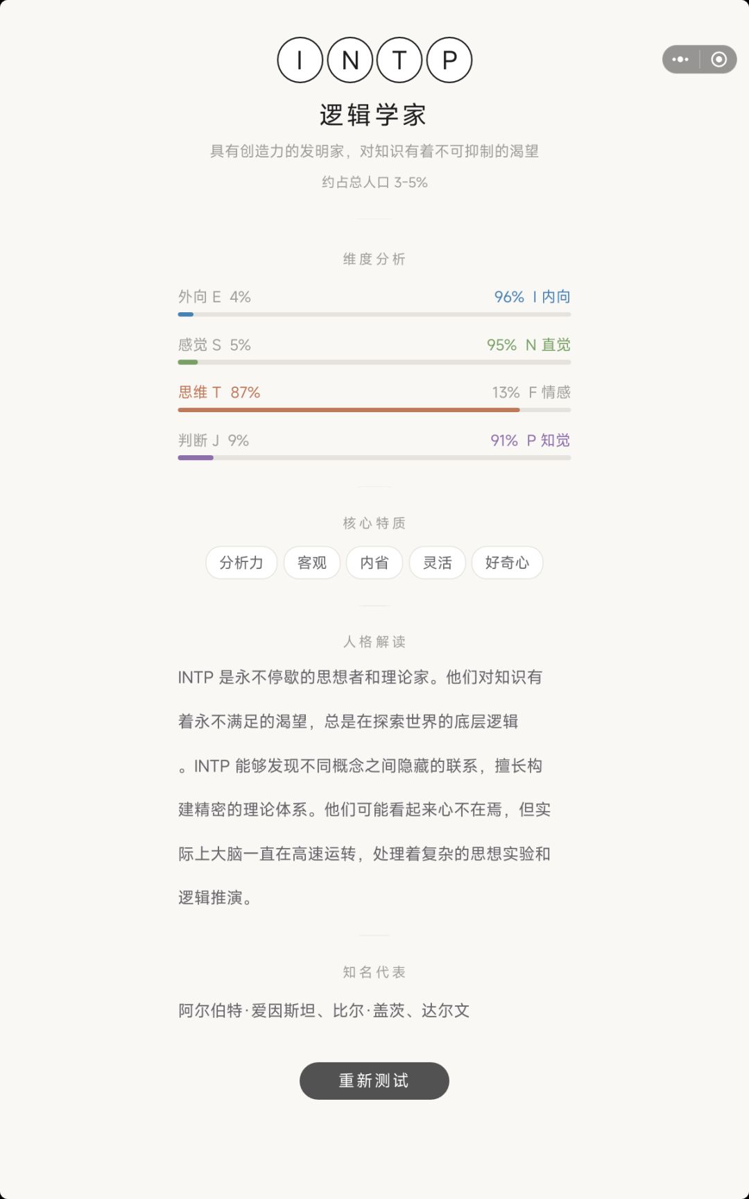 小建议:感觉可以隐藏右上角的属性,改成ie/ns/tf/pj题目还有选项位置完全随机的。因为我感觉可以很明显的看出上面的那个选项或者下面的选项是偏向哪个属性的