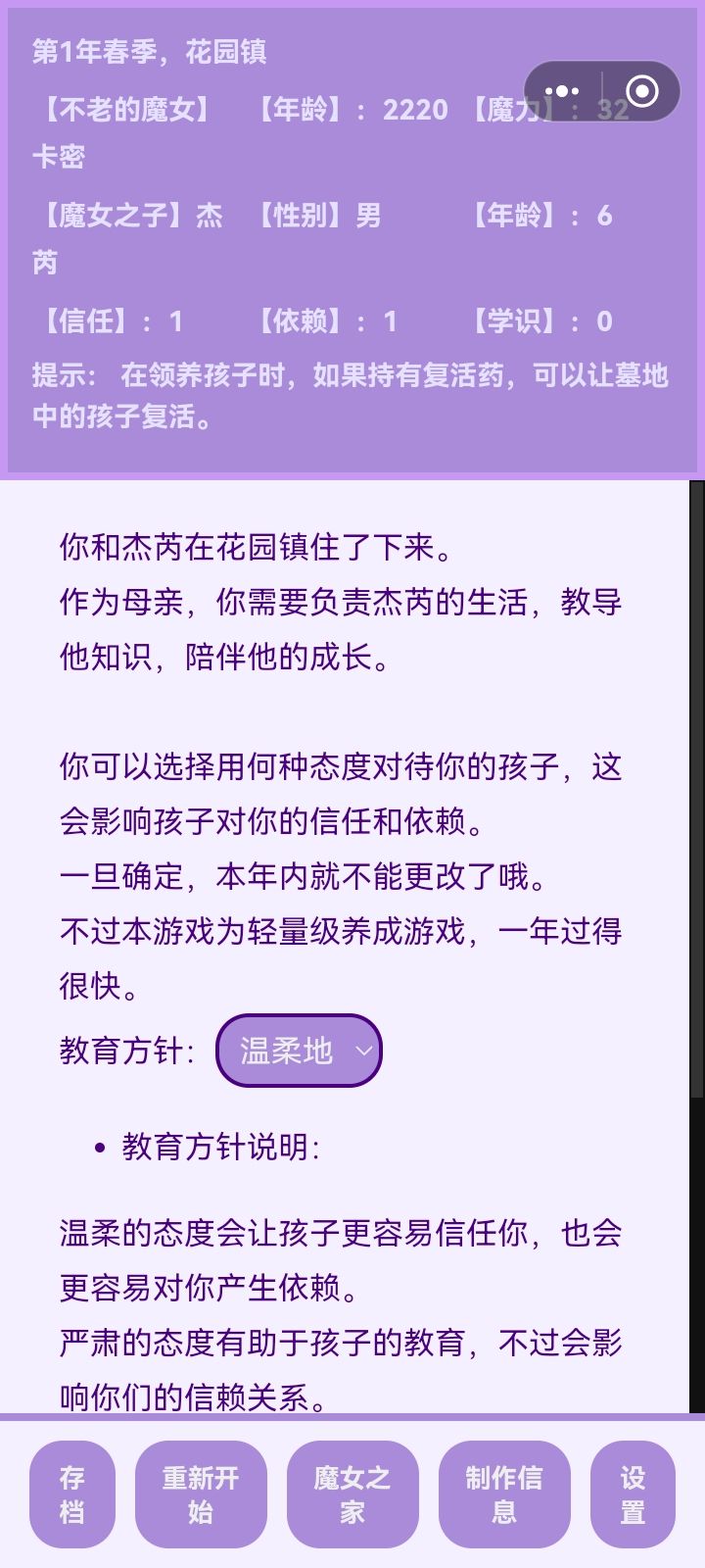 可玩性不是很高,跟前面说的那样,固定的养孩子流程,只有信赖依赖学识和教育方针四个培养点,前三个选温柔教育方针基本可以提升,我换成其他教育方针之后看文案总是觉得不得劲,把孩子养得太苦了,不是骂孩子就是不管孩子。