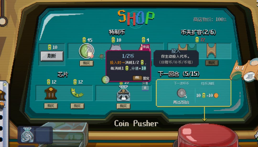 如果想获得更多能够增加底分的代币,可在初期先在商店购买提升追加分值的特殊代币:如黏住旁边代币则+8分值【胶胶币】、存在场上时所有同代币分值都+5的【友友币】、每回合初始分值+15的【古玩钱币】……