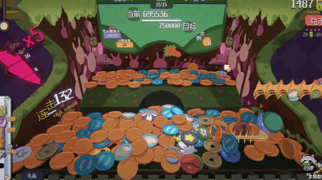 只不过在推币机中,你无需再大费周章往卡牌上凑分,只需思考如何灵活利用夹币中的“特殊代币”、礼品和BUFF,来实现分数的最大化即可。