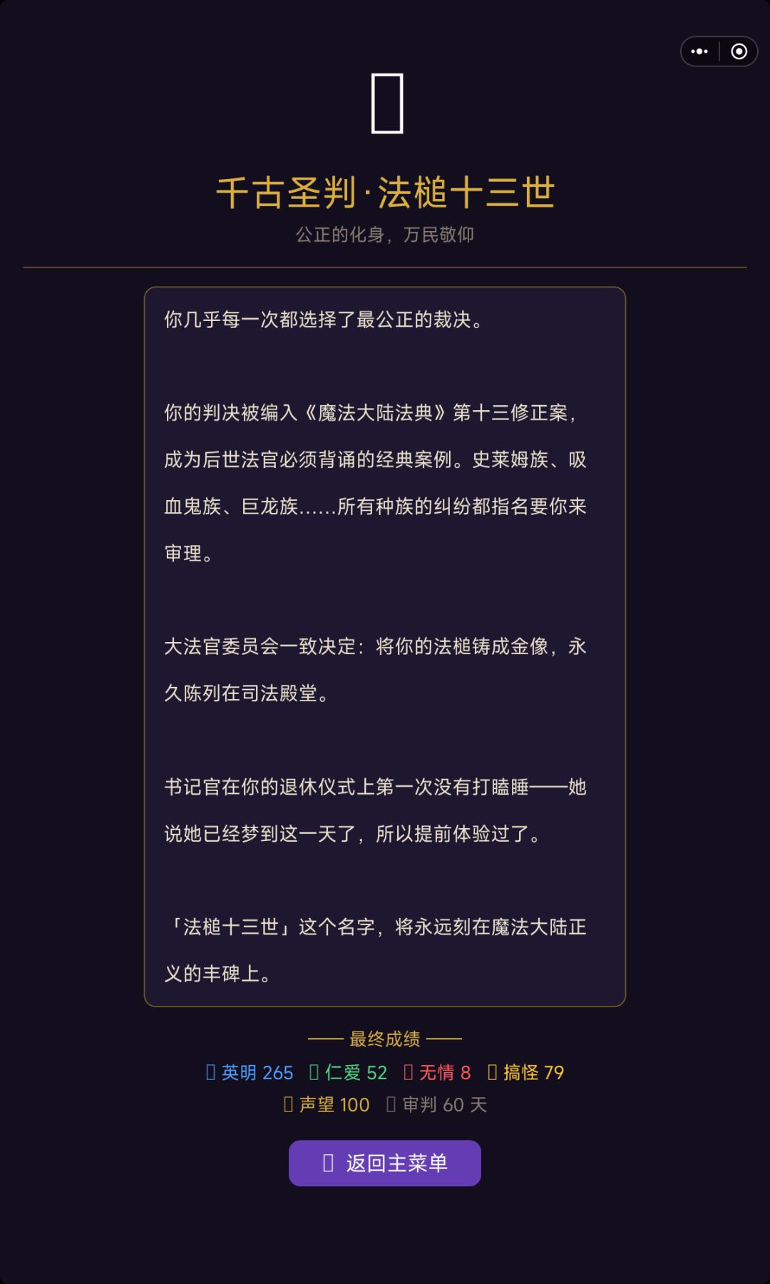 非常好玩且有趣的游戏,1小时左右流程,主要是期待案件后面也很好体验感的话,就是如果喜欢这种类型文字游戏的话,超级推荐,让人体验模拟器在异世界当一位法官,了解异世界里的各种生态作为法官,律师证人,被告与原告的关系,在其中去选择自己想选的选项,共同判断和帮助达成 自己想要当的法官。真的很好玩作者加油!