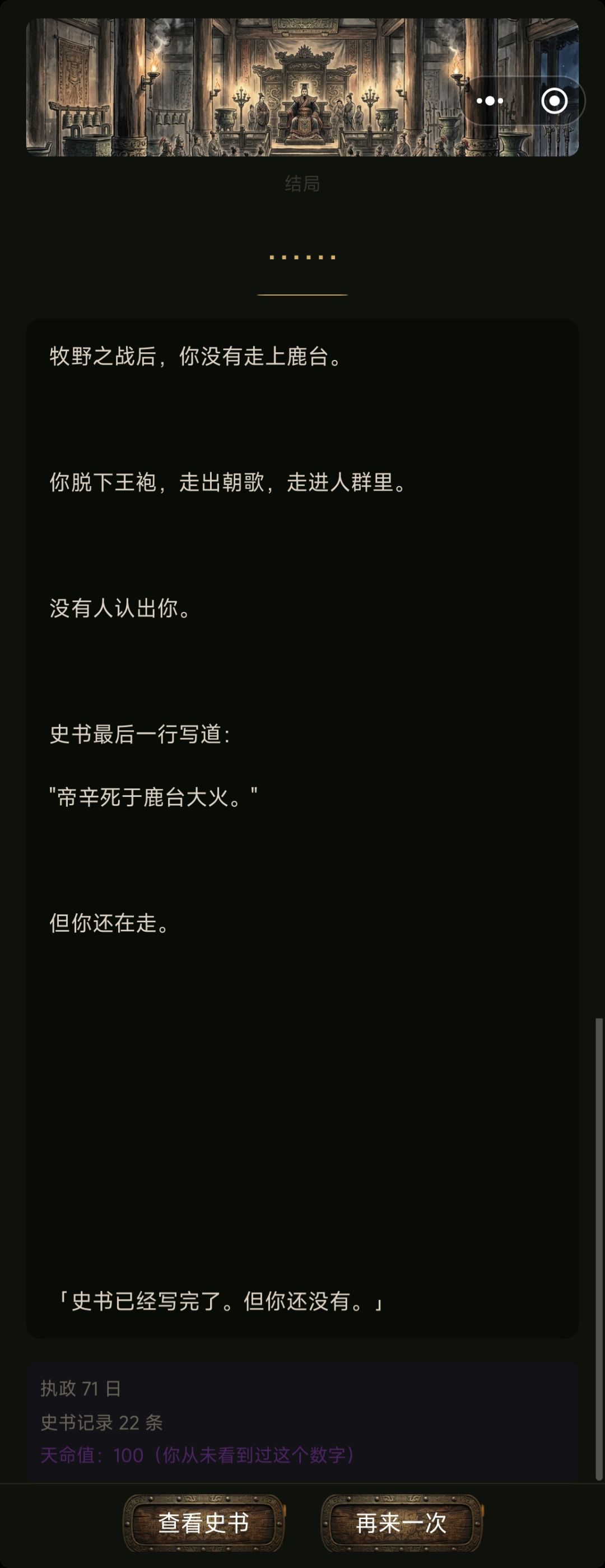 《殷本纪》“第66日:帝辛在城墙反语旁写下‘我知道’,既不愤怒也不辩解。此举超越了常规帝王的应对,展现了一种超脱的自知之明。”