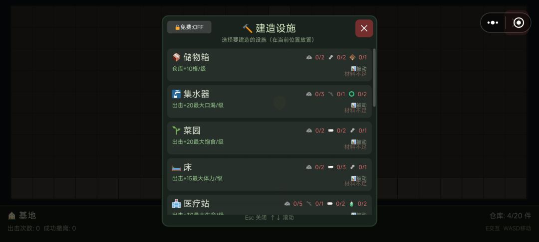 外围养成可以消耗探索获得的资源来建造幸存者营地,所需资源较多,且需求量逐步增大。设施列表较多,包含功能类和资源产出类,建造好资源类设施即可按周期获得资源,减少生存压力。