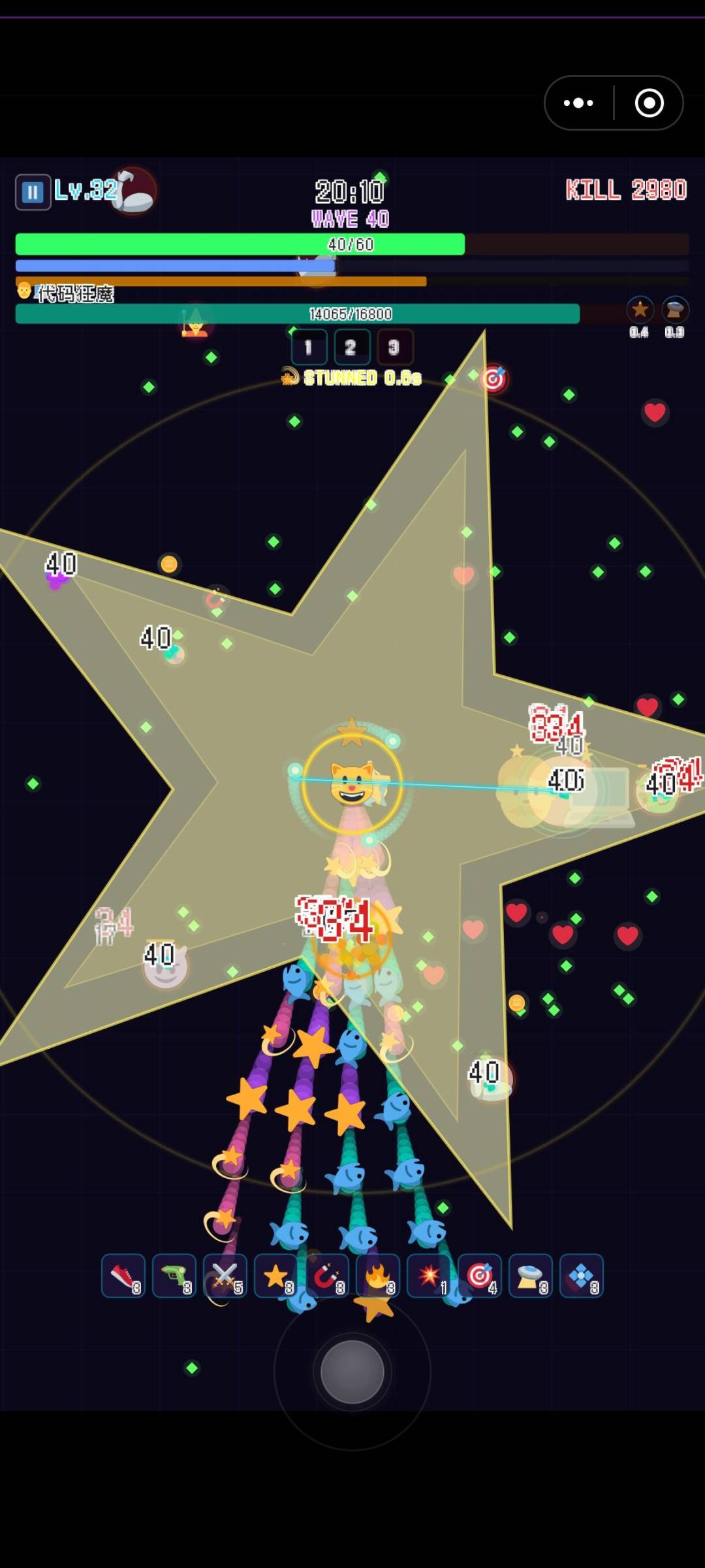 游戏内容很简单,就是一直打下去看你能生存多长时间,我带着我家小狗出门溜圈到死亡一局打了20多分钟,清了四波BOSS,BOSS就是比较大的表情包,你一眼就能看出来,而且基本都是和职业有关,特别是那个厨师还带着锅打我。