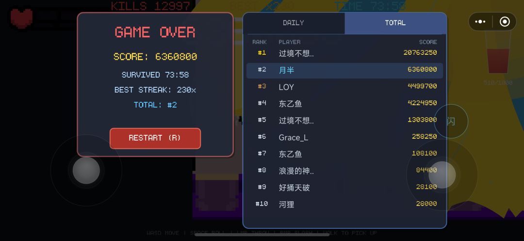 喜欢回旋镖类的游戏,玩起来很上头,前期砍小橙子有种连招的快感,后期通过回收轨迹大面积清怪有种看到塞尔达传说中时之力逆转武器轨迹化险为夷的惊喜,再往后就是纯割草了,配合音乐越玩越爽,希望提高点后面的难度(反弹墙壁完美角度命中椰子后背也很爽(我能成为全球榜一吗(过境在干嘛啊!