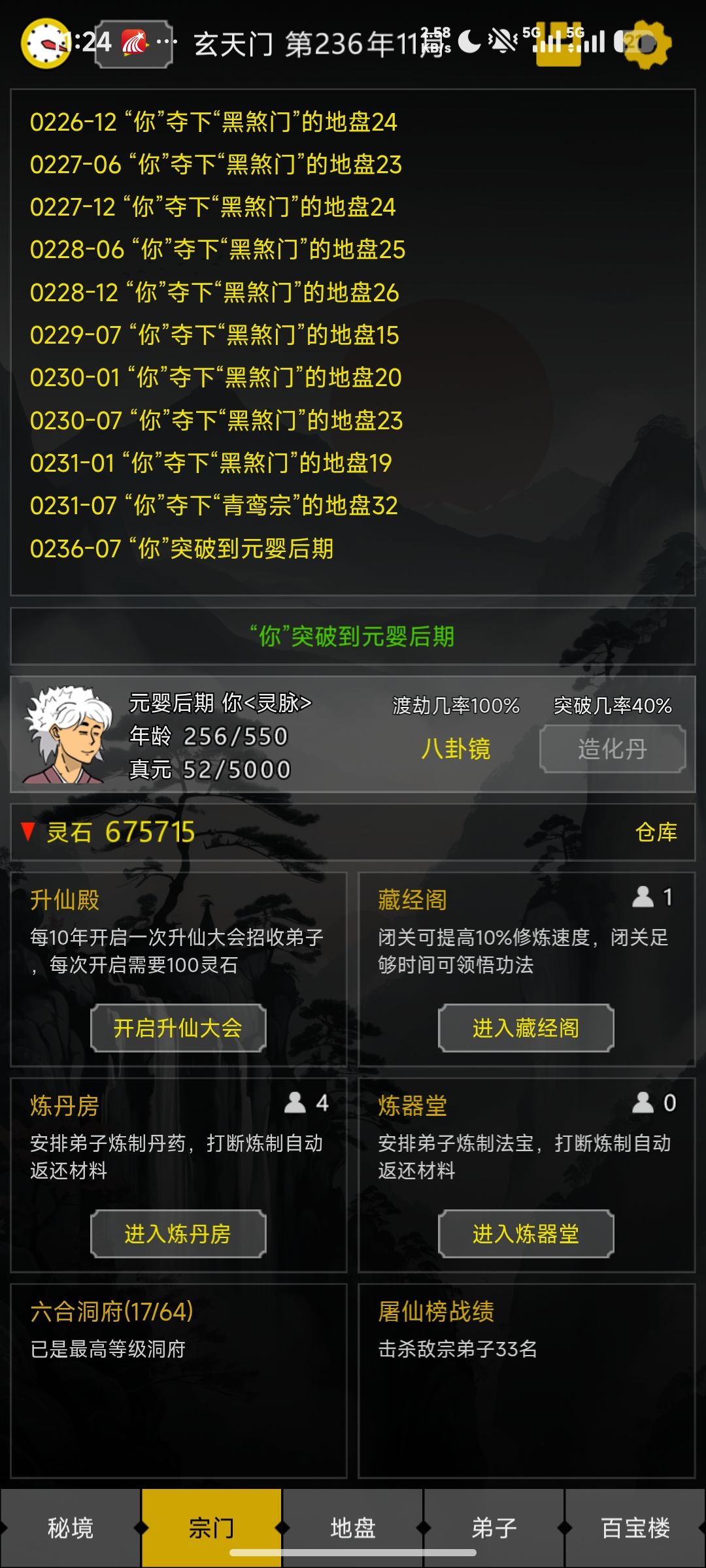 需要注意的是,主角突破化神的时候,必定会有一个元婴巅峰投靠宗门,其他两宗必定刷出一个元婴巅峰的老祖(一开始我还不知道,害得我被秒了个筑基弟子,后续主角马上出关给那俩元婴巅峰杀了😁)