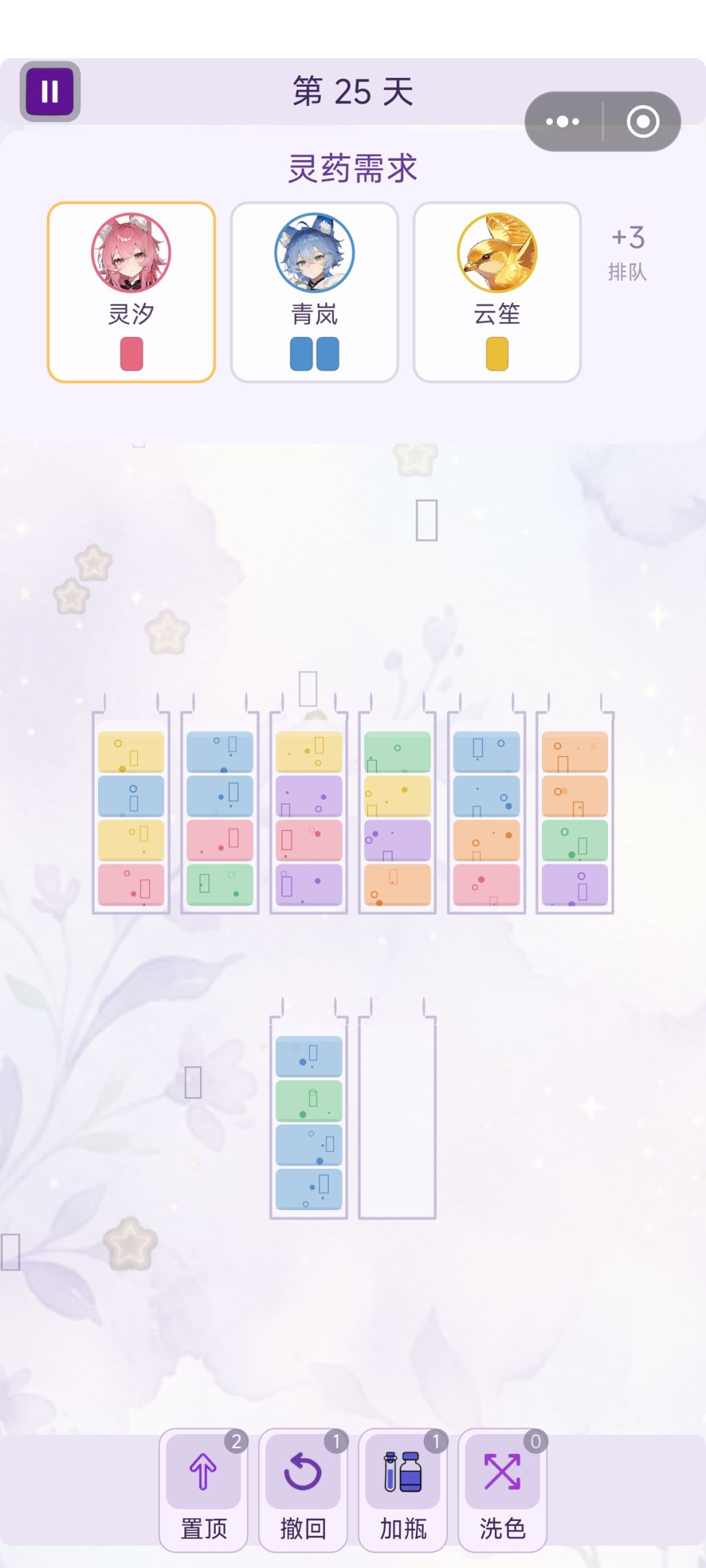 再评:小美女已经化形,后面的关卡还是挺难的,限制了瓶子数目后有时第一步走错就只能用道具,不知道有没有做必定有解的检测?