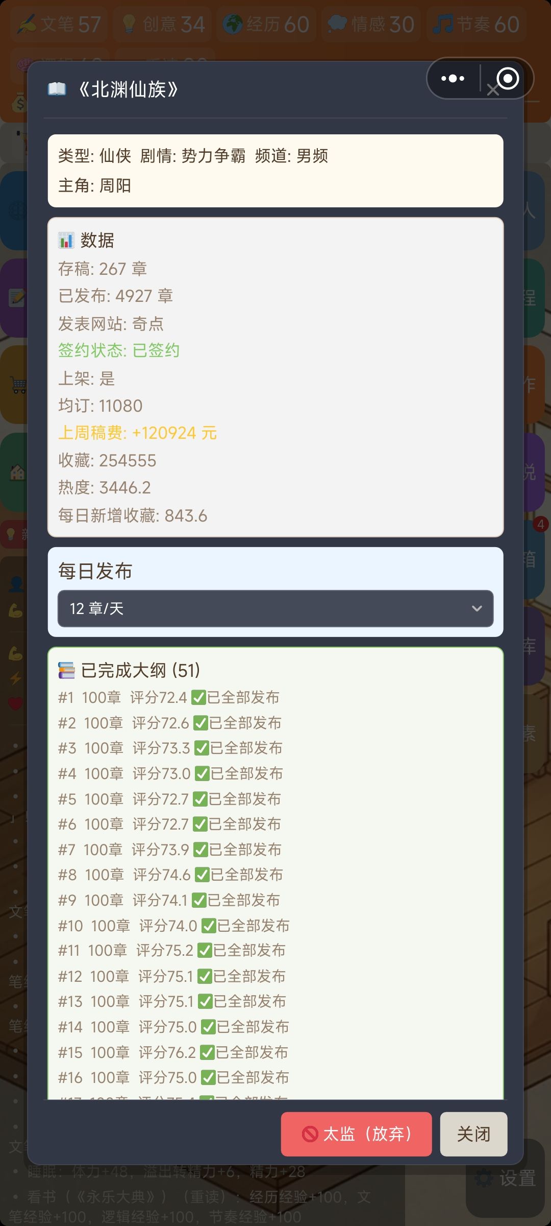 第四本:收藏250000,5000章+(目前还在连载,没有完结的计划),综合评分76,均订1万+,周收入稳定十万+。北渊仙族,主角周阳。从第四本开始,每天吃着400块的奢侈餐,每天加10健康,根本不用担心健康度。这个时候手速达到接近70级,写一次小说呢写7到8章,一周写11次小说实现每天12更,彻底不做人了。收藏一路暴涨,达到均订破万,每周收入十万加。存了半年钱直接全款拿下公寓。