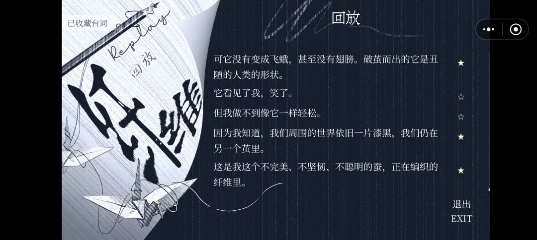 剧情一开始就围绕着蚕蛹顽强的一生展开叙述一开始或许还会让玩家有些发懵不过好在尽管还是DEMO版本后期也能前后呼应,后面是出门买水果偶遇学长他突然提及蚕蛹事件,我认为这个蚕蛹例子就是说明高中生在中式教育下的写照