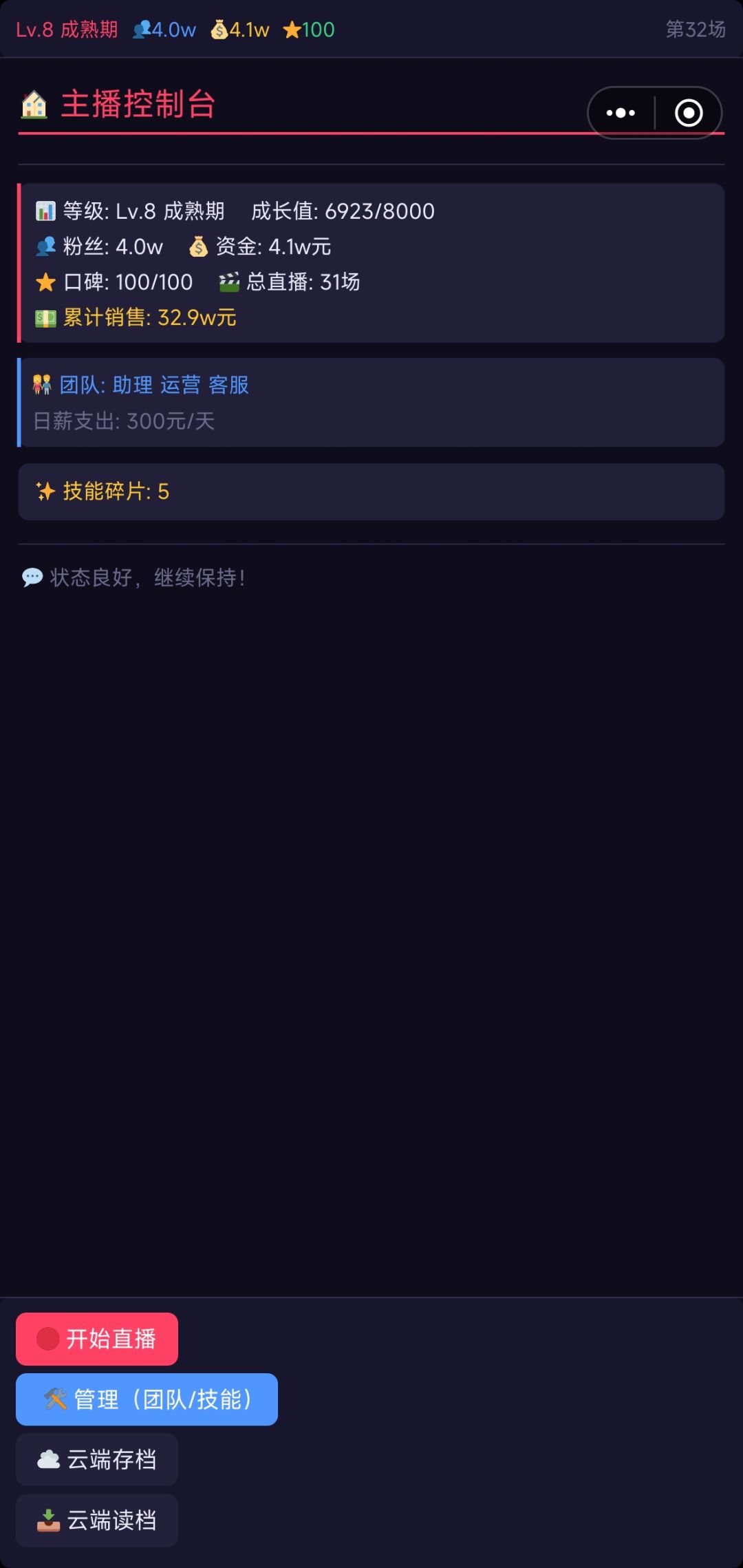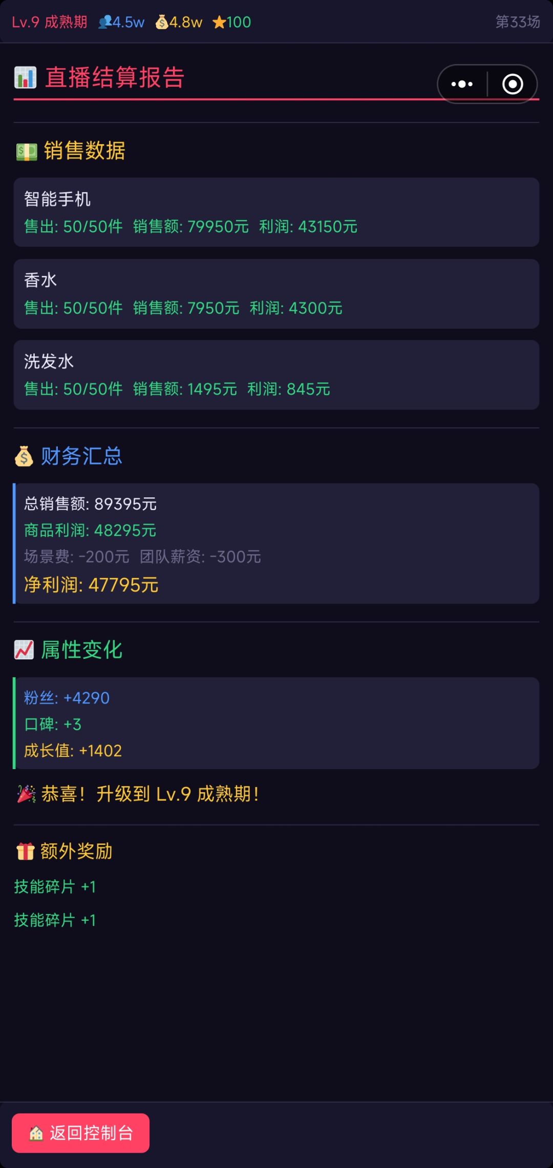 开始选利润最高的3个,预不预热无所谓,然后就开始盯着左下角点点点。。。一开始差点亏麻了,然后有个什么签约给你保底3000,选它,然后一路赚赚赚。估计是看粉丝量 到1w以后好像就稳定了。。如果有排行榜,还能有动力冲一冲,现在眼看着一场直播赚2 3w,钱都没地儿花也是没招了。