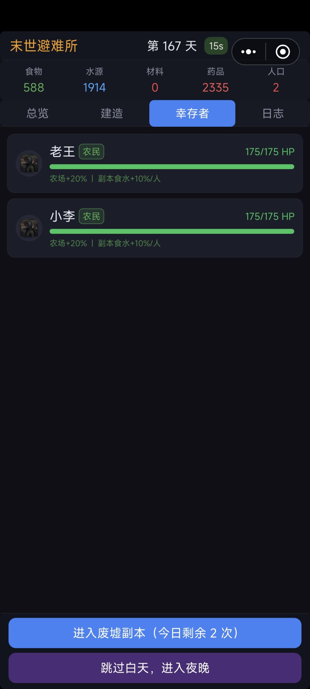 体验了一下,是一款还不错的一款小游戏。玩法就是收集物资,升级建筑,带着你的求生小队活下去。
