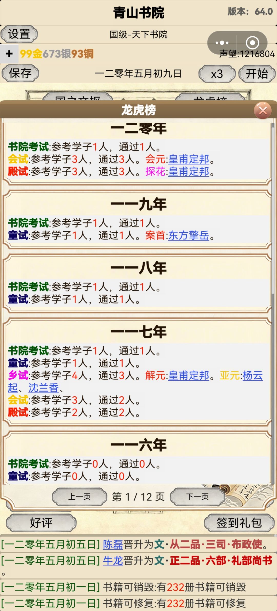 1.能不能出一个改名字的功能啊,自己喜欢的学生自己培养!!!我想三元及第啊!!!要么培养培养着他不考了入仕当官去了!要么总是没等学好就自己去考试了!!!100多年一次三元及第都没有!!!太气了!!!案首_解元_会元_我期待好久的状元,结果是探花,太气了!或者就去从仕去了,根本不继续考了!能不能人工干预什么时候放他去考试啊!!!!别好苗子学着学着没了,退学的能不能挽回一下啊!!!我要三元及第!!!!!