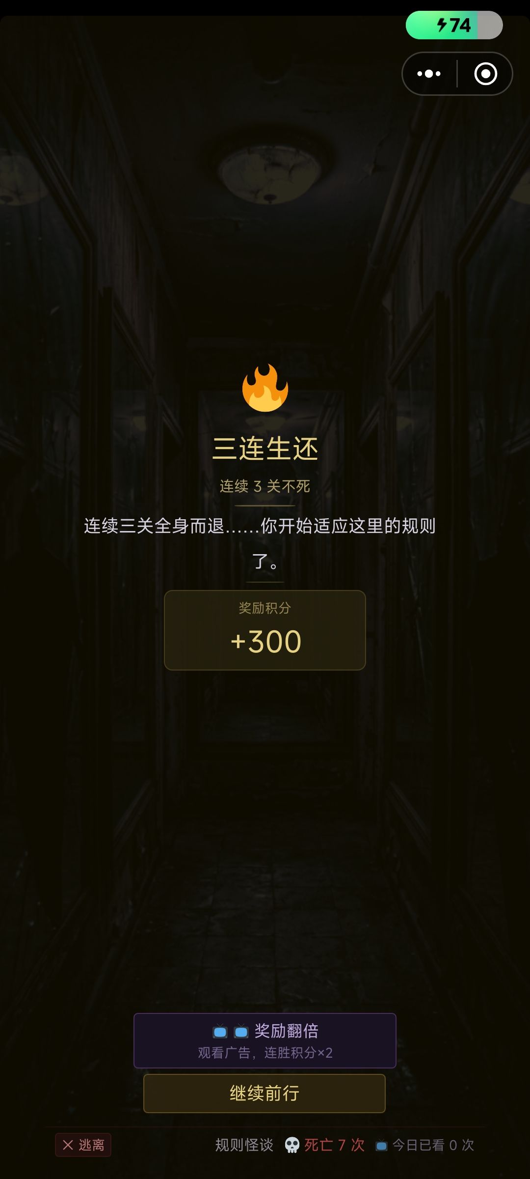 游戏过程中大部分时间是在看文本,首次通关用时会长一些。之后就是纯选项操作,凭借短时记忆可以很容易做出正确选择。没做存档功能,若san值完全用光只能从头再来。从第六章开始,正确选项被广告所覆盖,选择需要先看广告,意味比较明显。